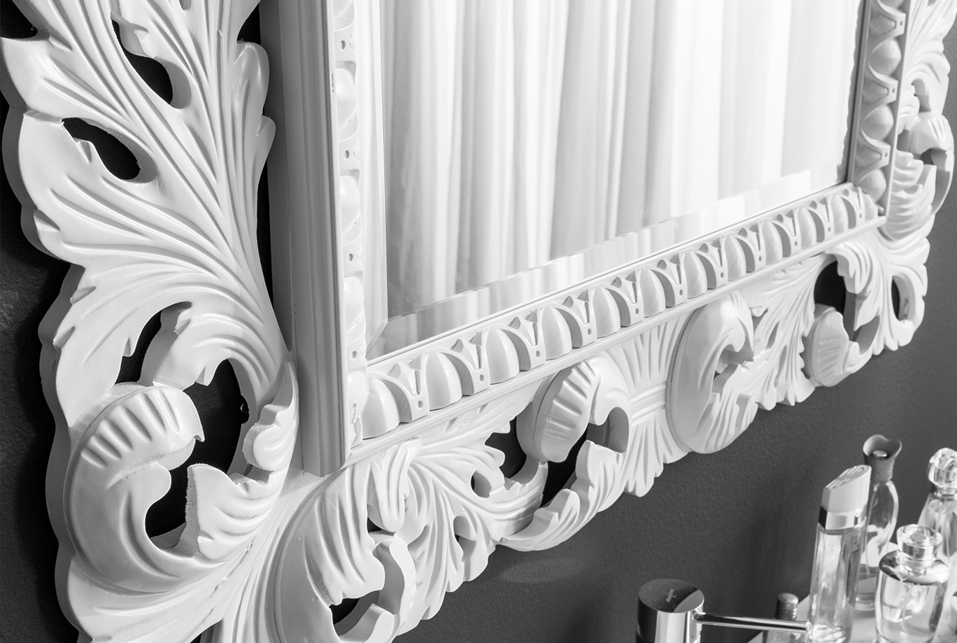 Specchio filo lucido con cornice in legno ad intarsi.