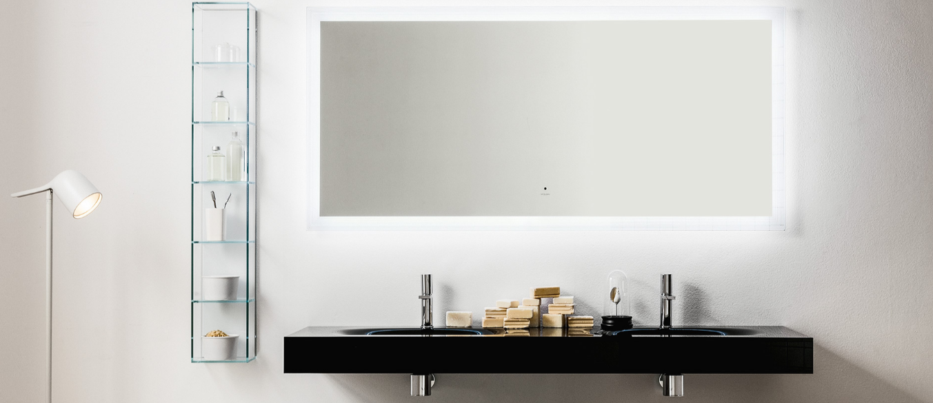 Realizzato completamente in Opalite by Artelinea il bancone Regolo permette di esplorare la libertà espressiva e progettuale nelle dimensioni, nella scelta dei lavabi e negli abbinamenti con altri mobili. Linee orizzontali e super?ci pure sono sottolineate dalla lavorazione dei bordi a 90° e valorizzate dalle caratteristiche del materiale: il tutto per un effetto di “tutto pieno” in Opalite.