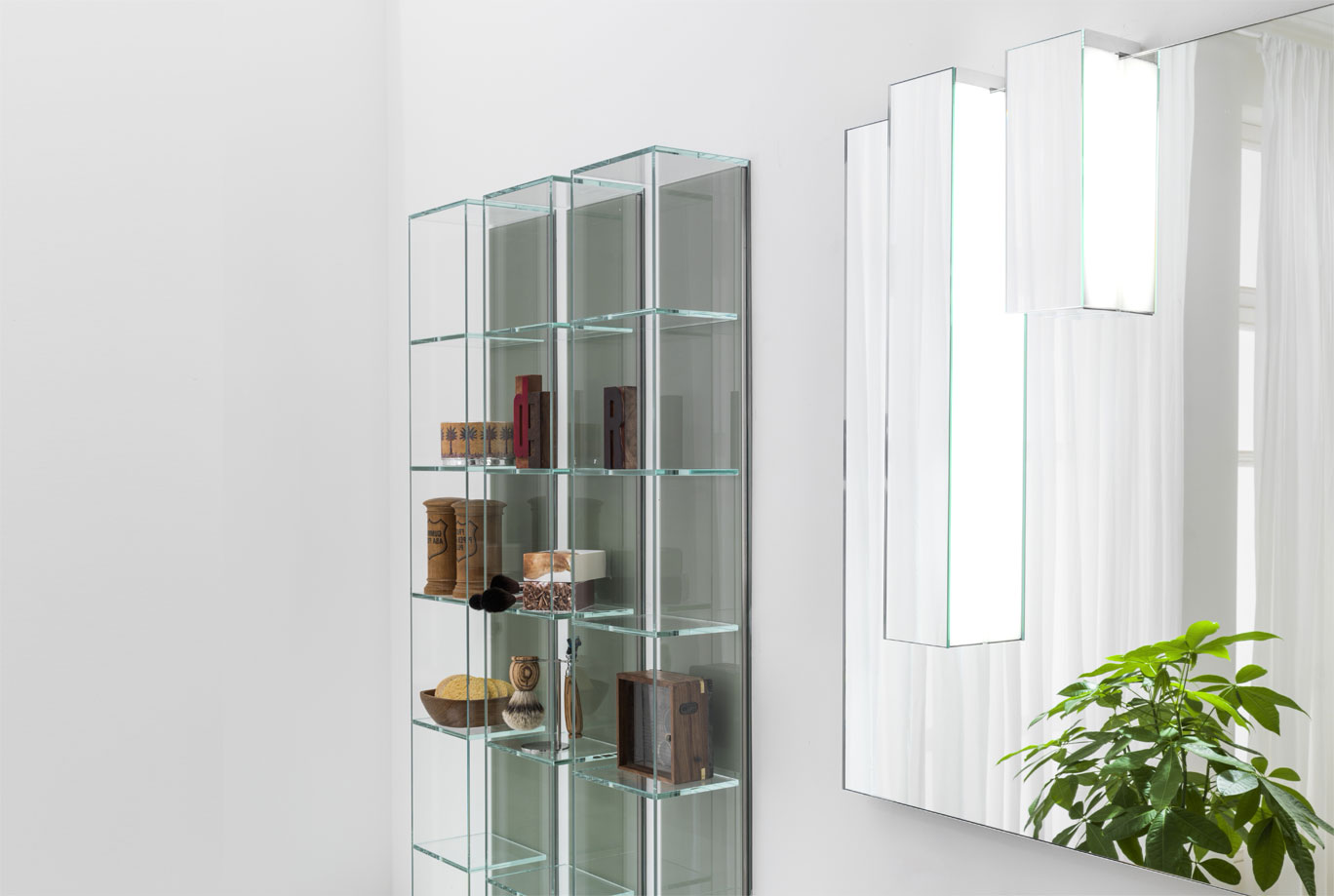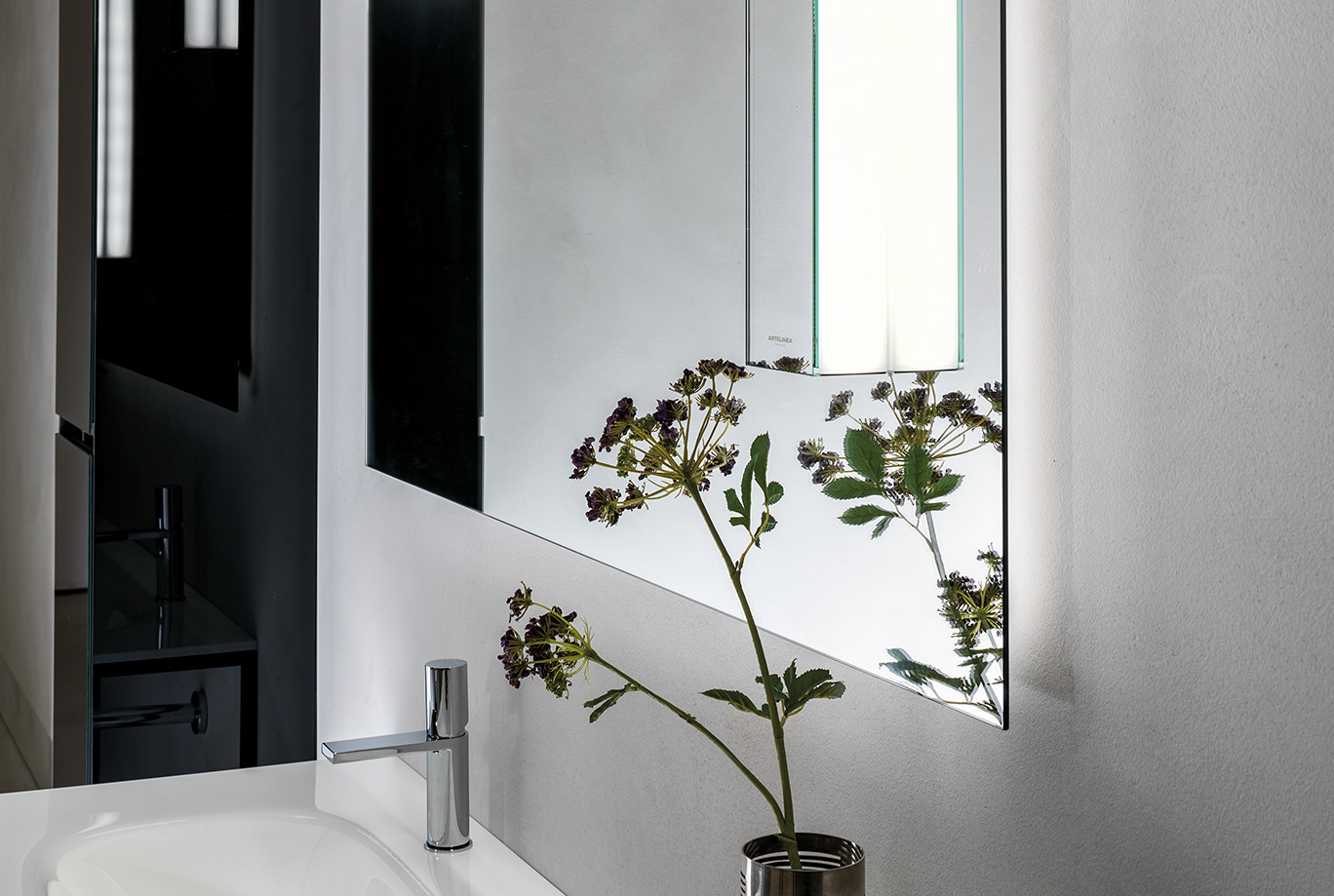 Specchio spessore 5 mm bordo con filo lucido con e senza led diffusion, trasformatore 220/12V ed interruttore sensor completo di telaio. Lo specchio è corredato di binario di scorrimento e supporto elettrificato per inserimento lampade. Le lampade possono essere spostati lungo lo specchio, rimosse per la pulizia e intercambiate fra di loro.