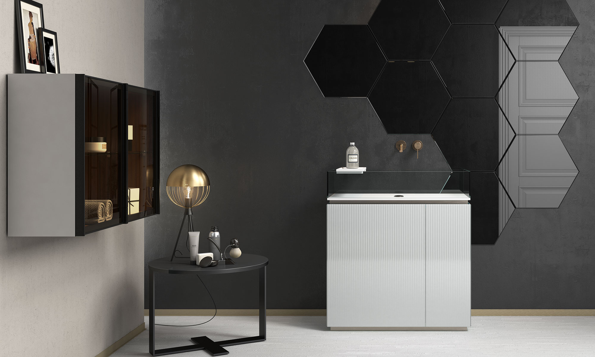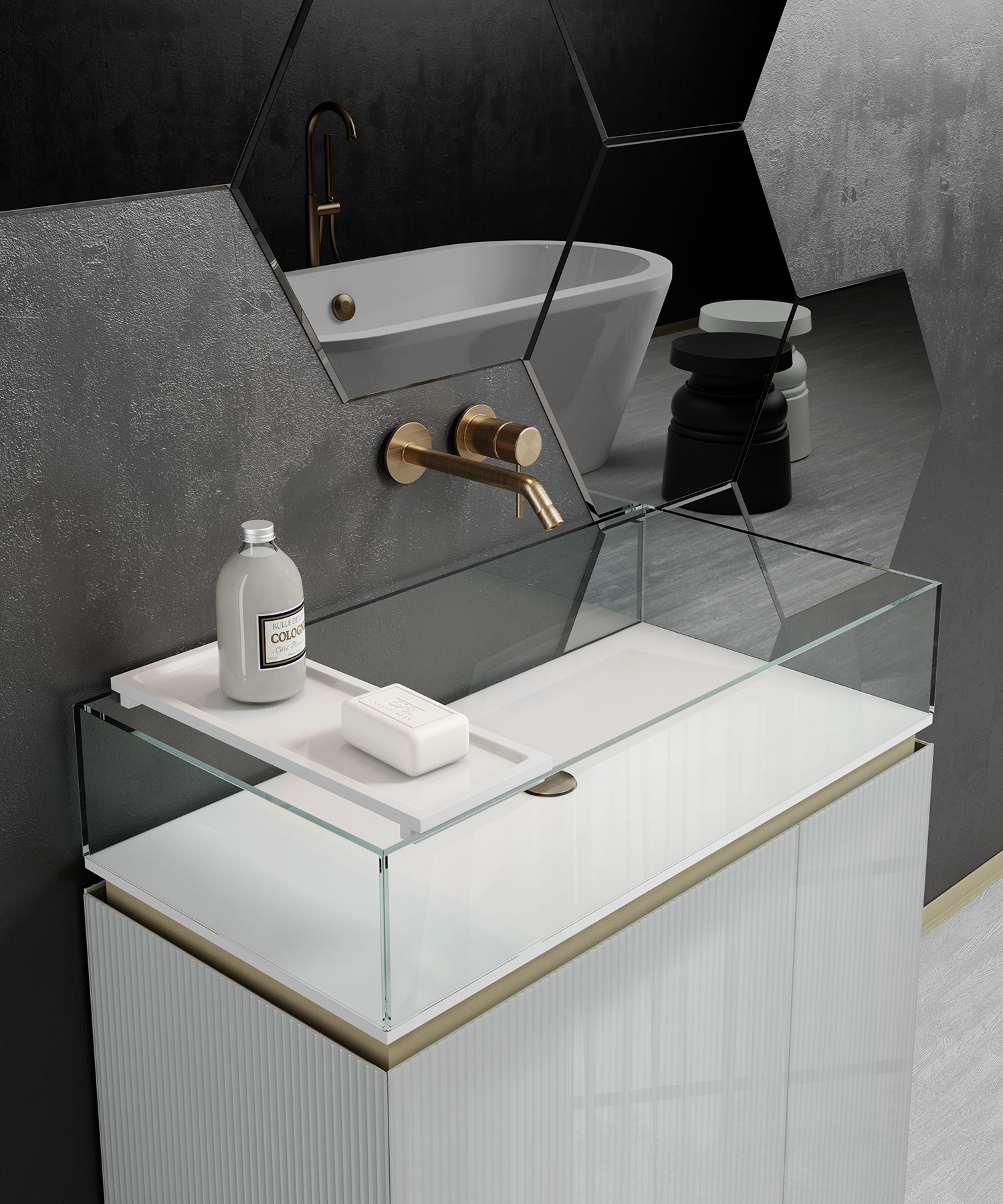 Sintesi tra rigore formale ed eleganza materica, la collezione Plissé dà vita ad una serie di totem lavabo contenitivi realizzati totalmente in vetro con particolari in metallo.