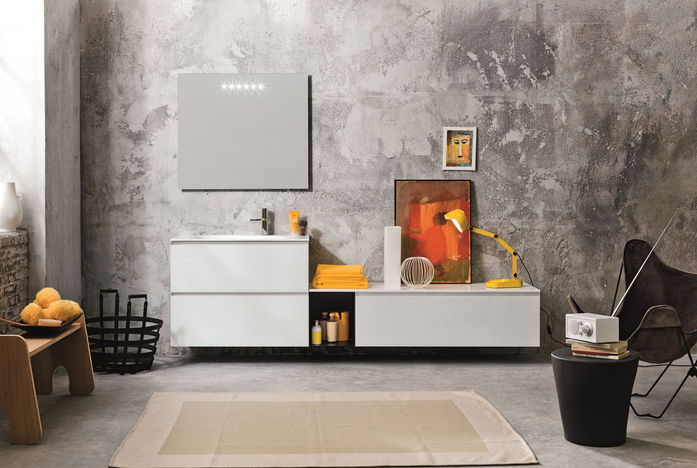 Per questa collezione è stato pensato un lavabo integrato dalla fusione particolare che permette di sfruttare al meglio tutta la profondità del mobile e di poter usufruire di miscelatori sia da appoggio che a muro.