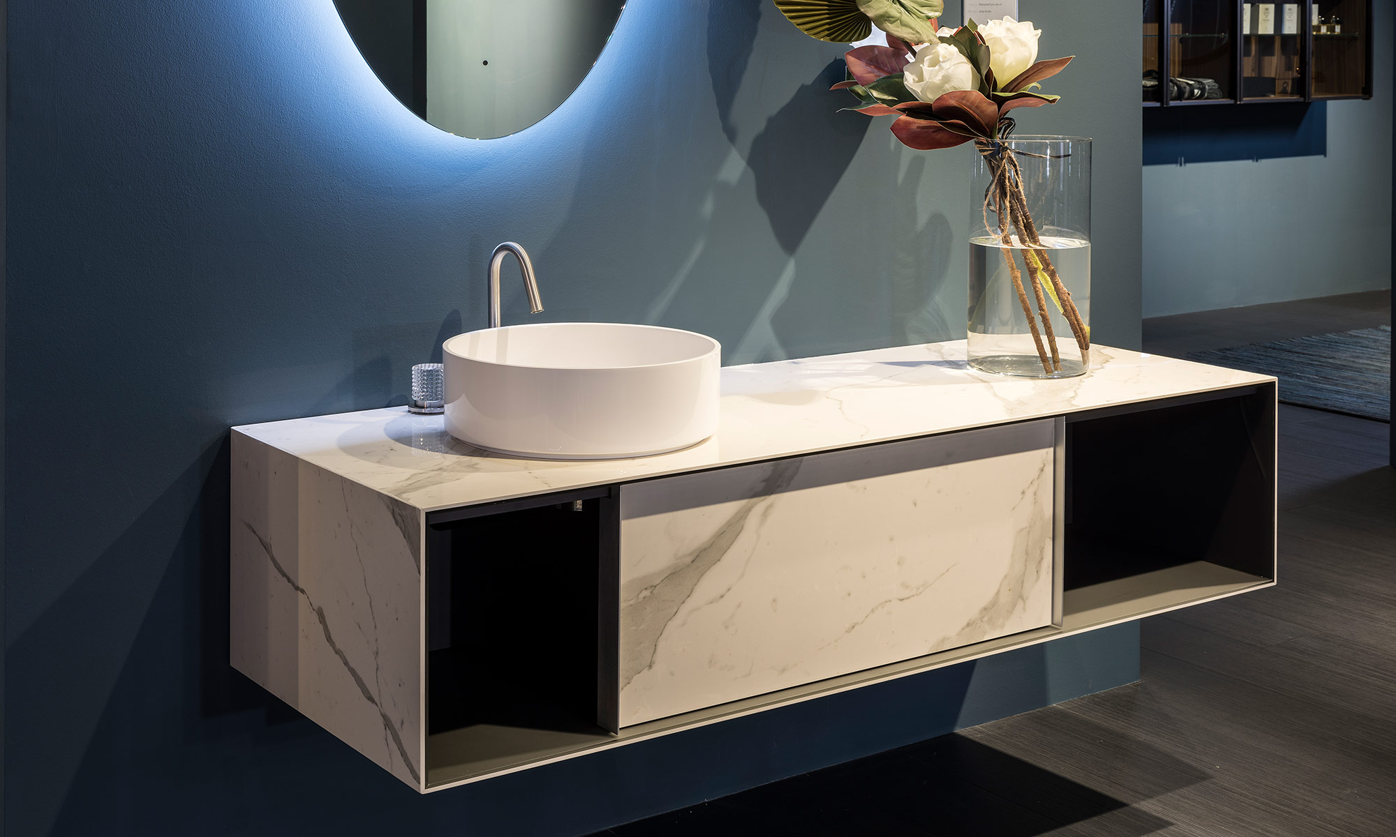 La razionalità del disegno del monoblocco è sdrammatizzata sia dalla componibilità interna data dai cassetti e dai vani a giorno, posizionabili liberamente all’interno dello spazio, sia dalla possibilità di abbinare colori diversi, grazie a Dualite.