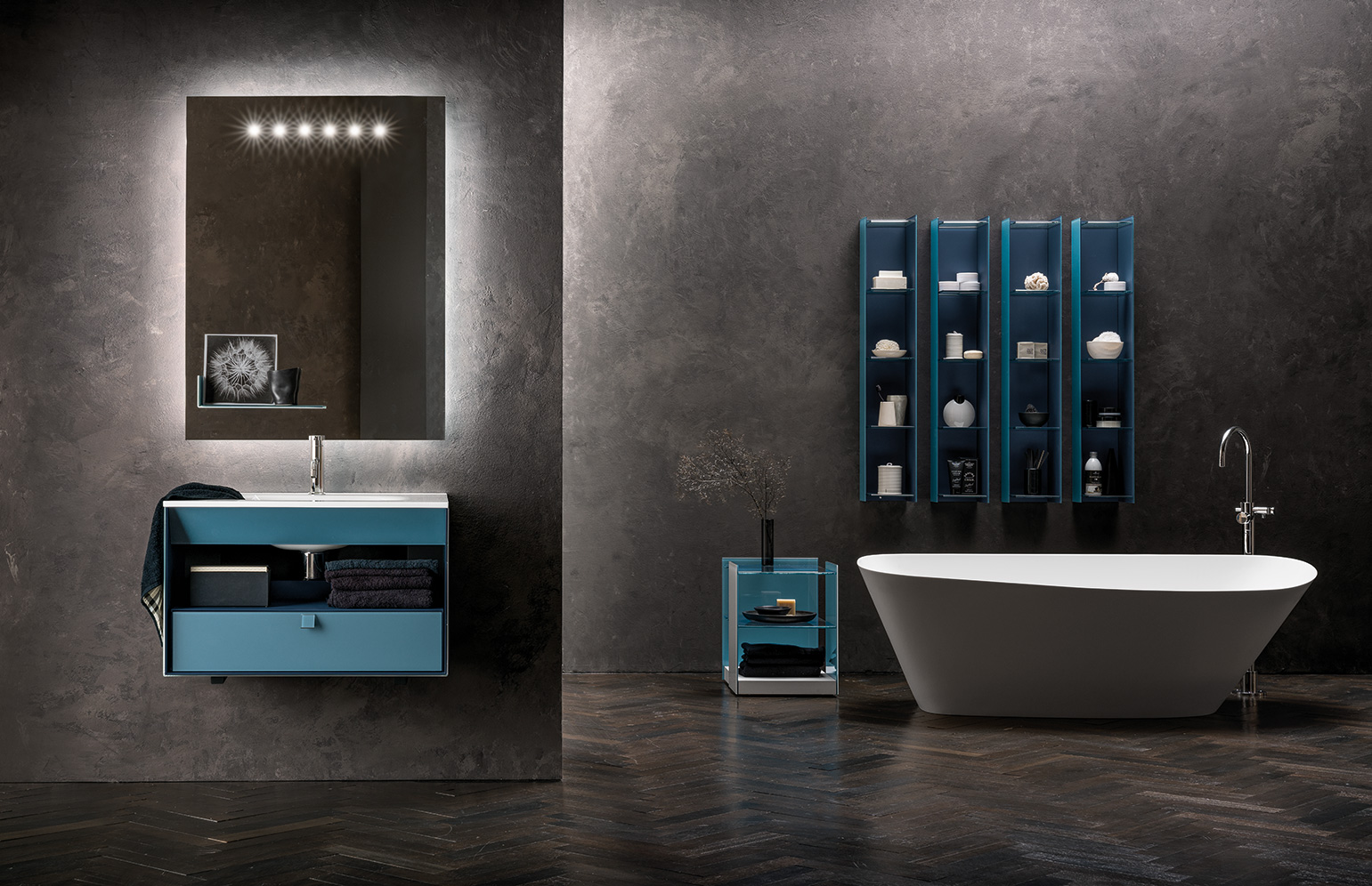 La razionalità del disegno del monoblocco è sdrammatizzata sia dalla componibilità interna data dai cassetti e dai vani a giorno, posizionabili liberamente all’interno dello spazio, sia dalla possibilità di abbinare colori diversi, grazie a Dualite.