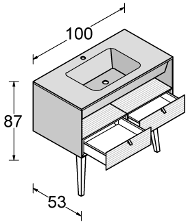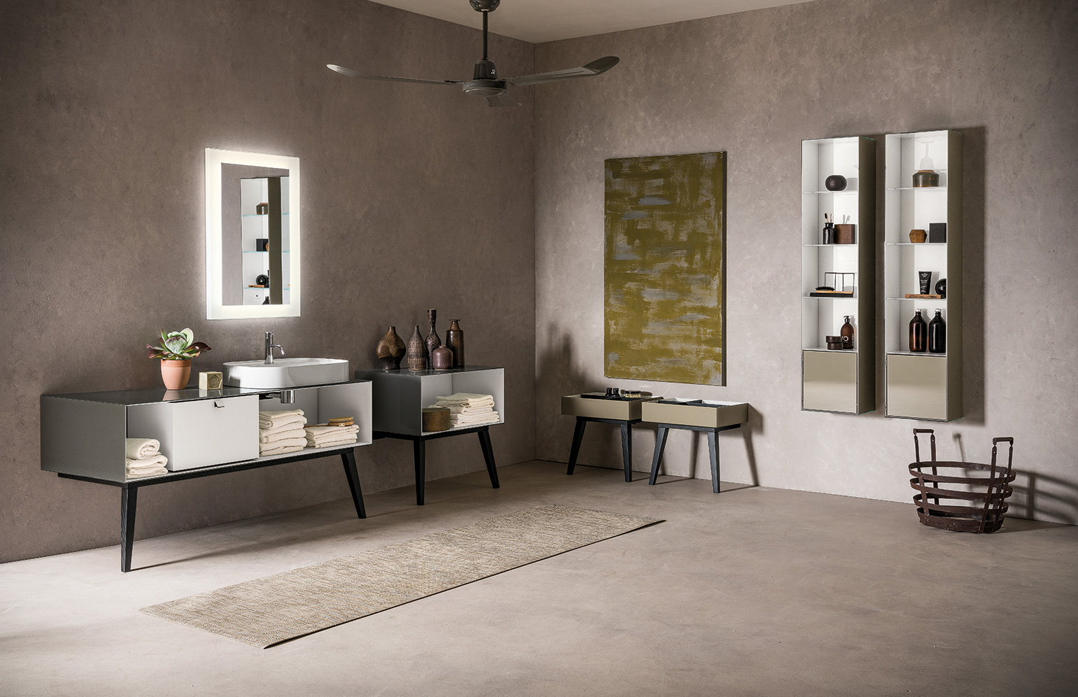 La razionalità del disegno del monoblocco è sdrammatizzata sia dalla componibilità interna data dai cassetti e dai vani a giorno, posizionabili liberamente all’interno dello spazio, sia dalla possibilità di abbinare colori diversi, grazie a Dualite.