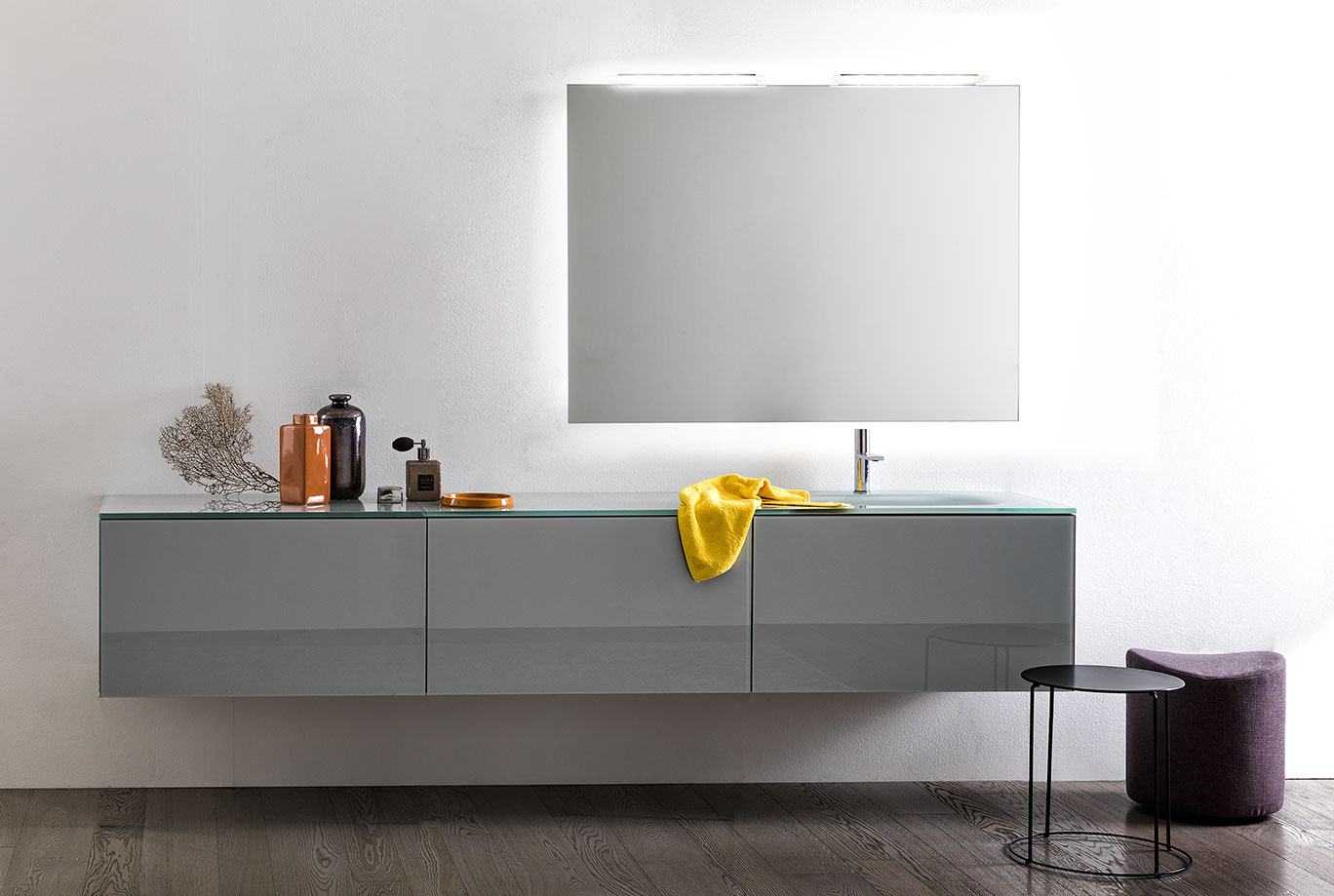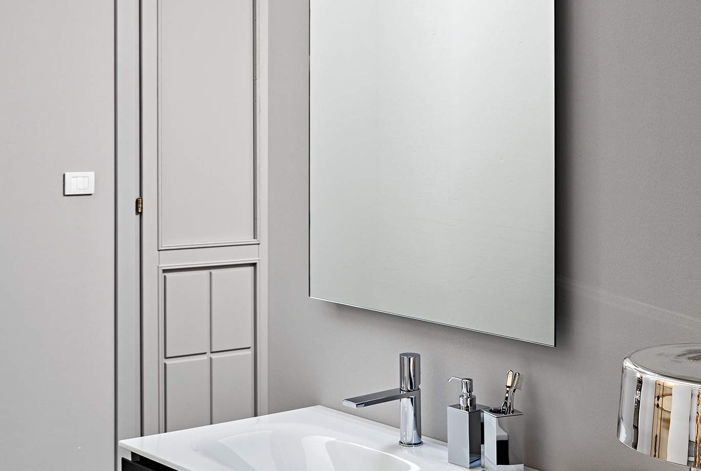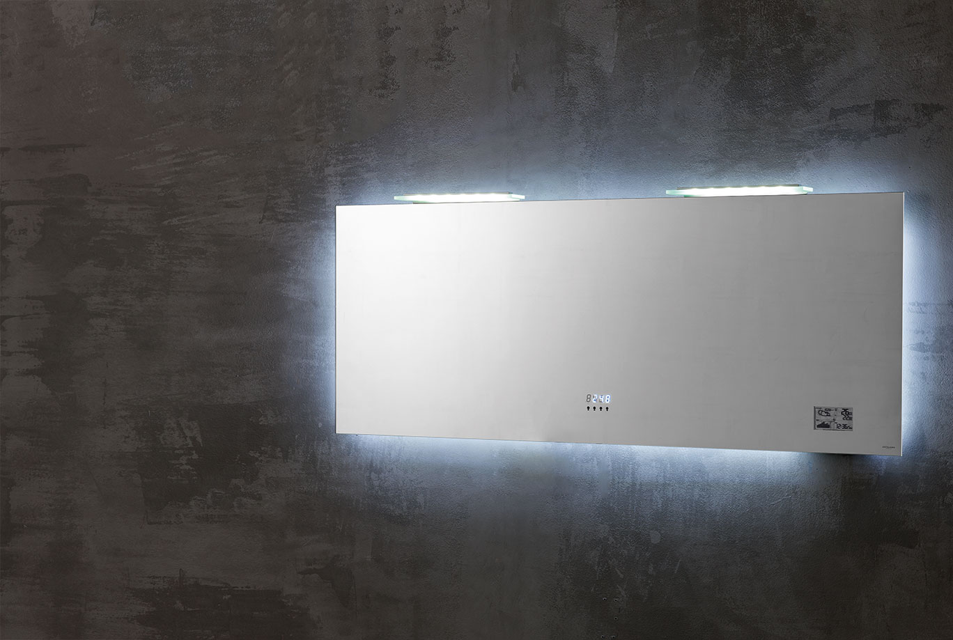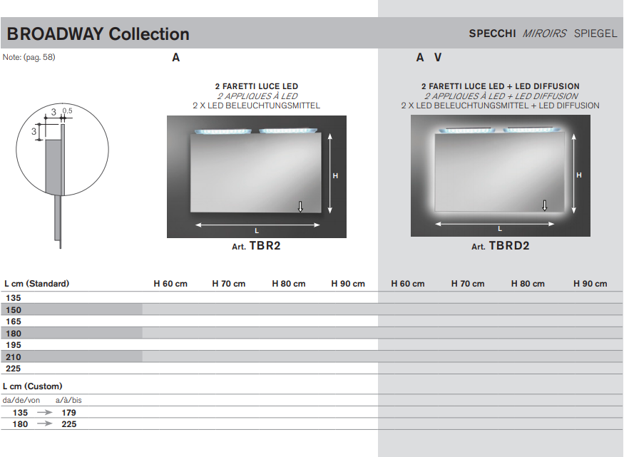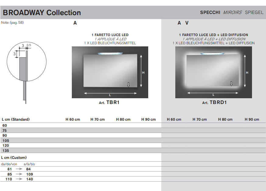 Specchi 5 mm bordo filo lucido con e senza led diffusion, trasformatore 220/12V ed interruttore sensor, completi di telaio e supporto per inserimento elemento luce. Di serie luce fredda 5500°K, su richiesta luce calda 3300°K.