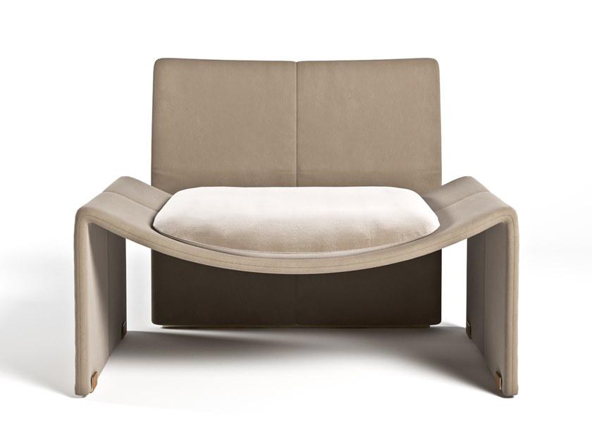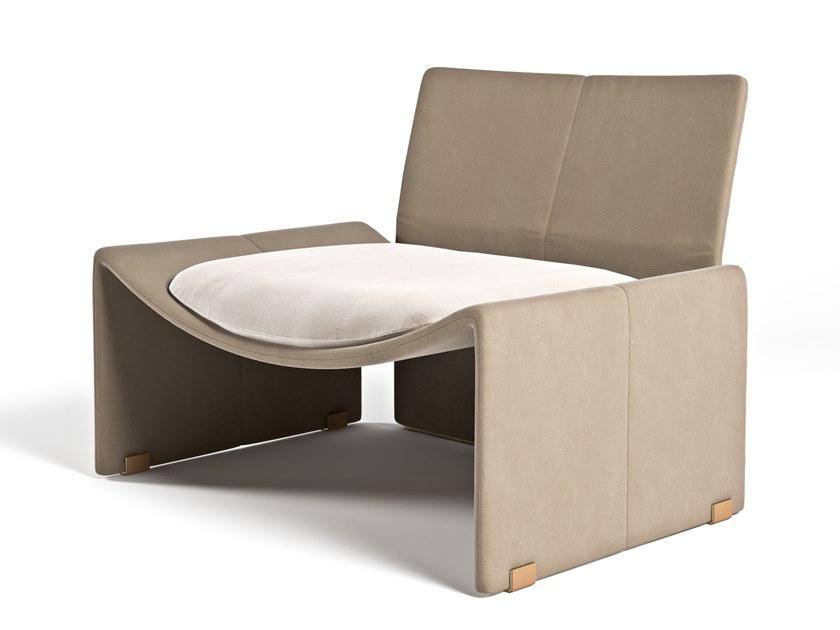 Lounge Chair, cm 93x77x70h Structure in Cuoio col. Taupe, seat and back cushions in Nabuk col. Powder, metal feet in light gold.