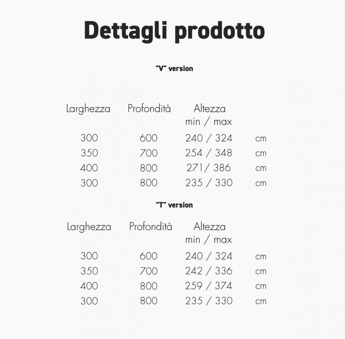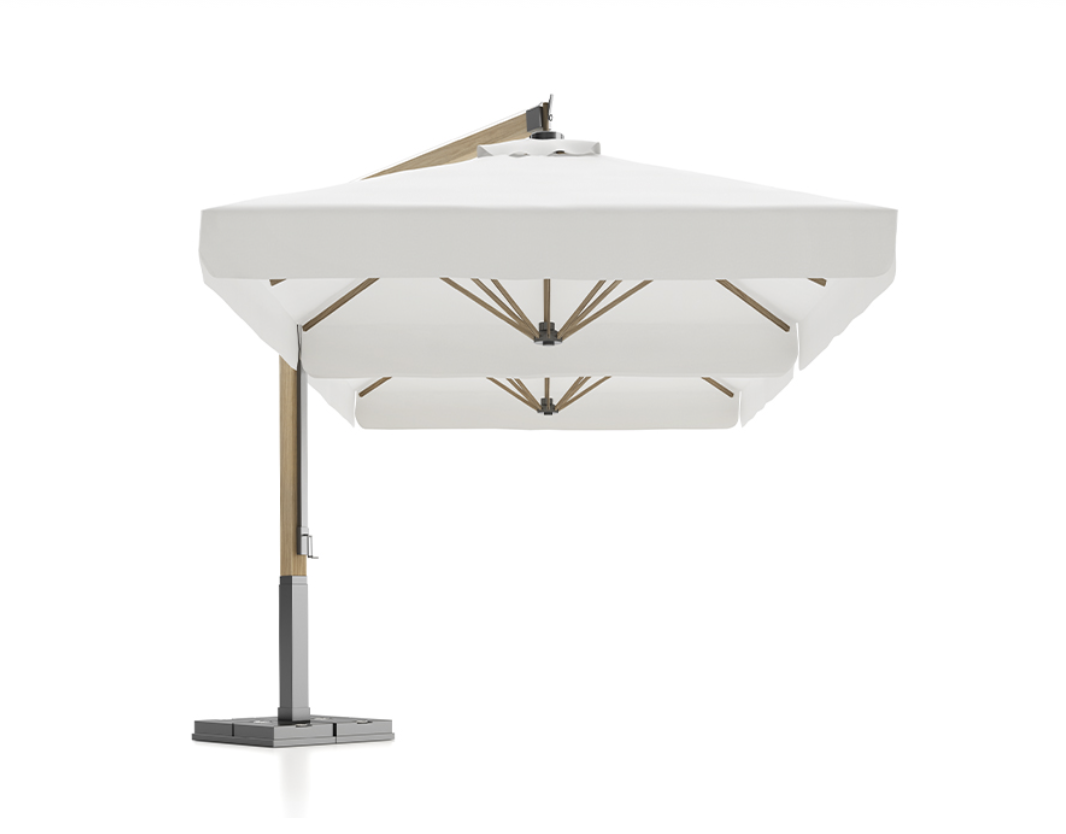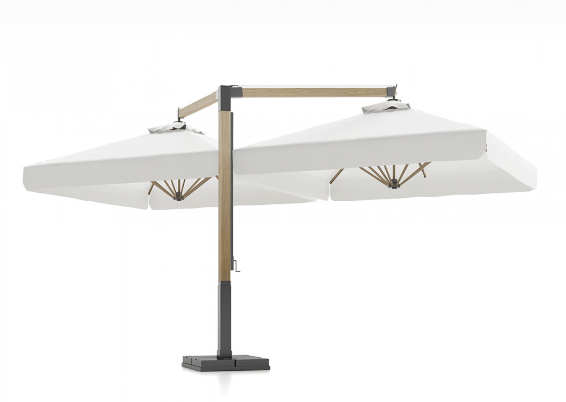 Composto da n. 2 braccia laterali e colonna centrale in alluminio verniciato grigio o in legno di iroko. Tessuto acrilico gr 320 bianco o ecrù. Soffietto antivento e canalina inclusi.