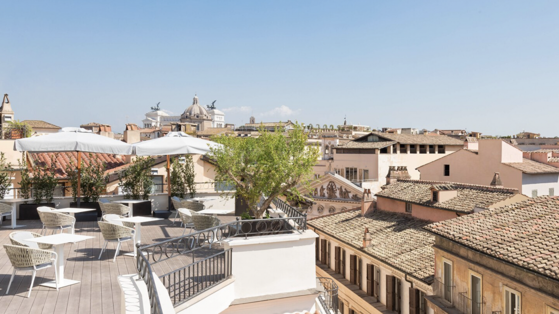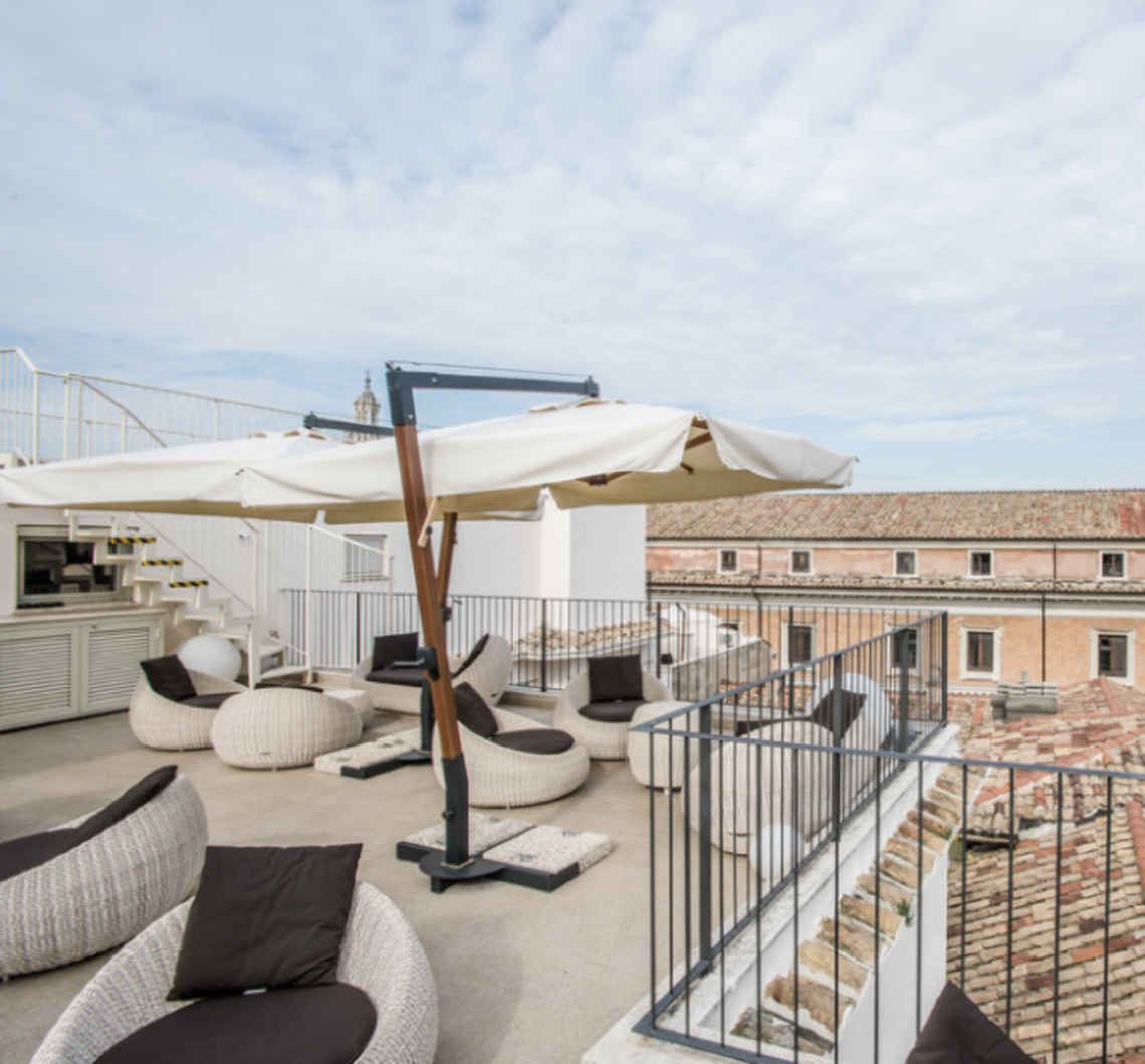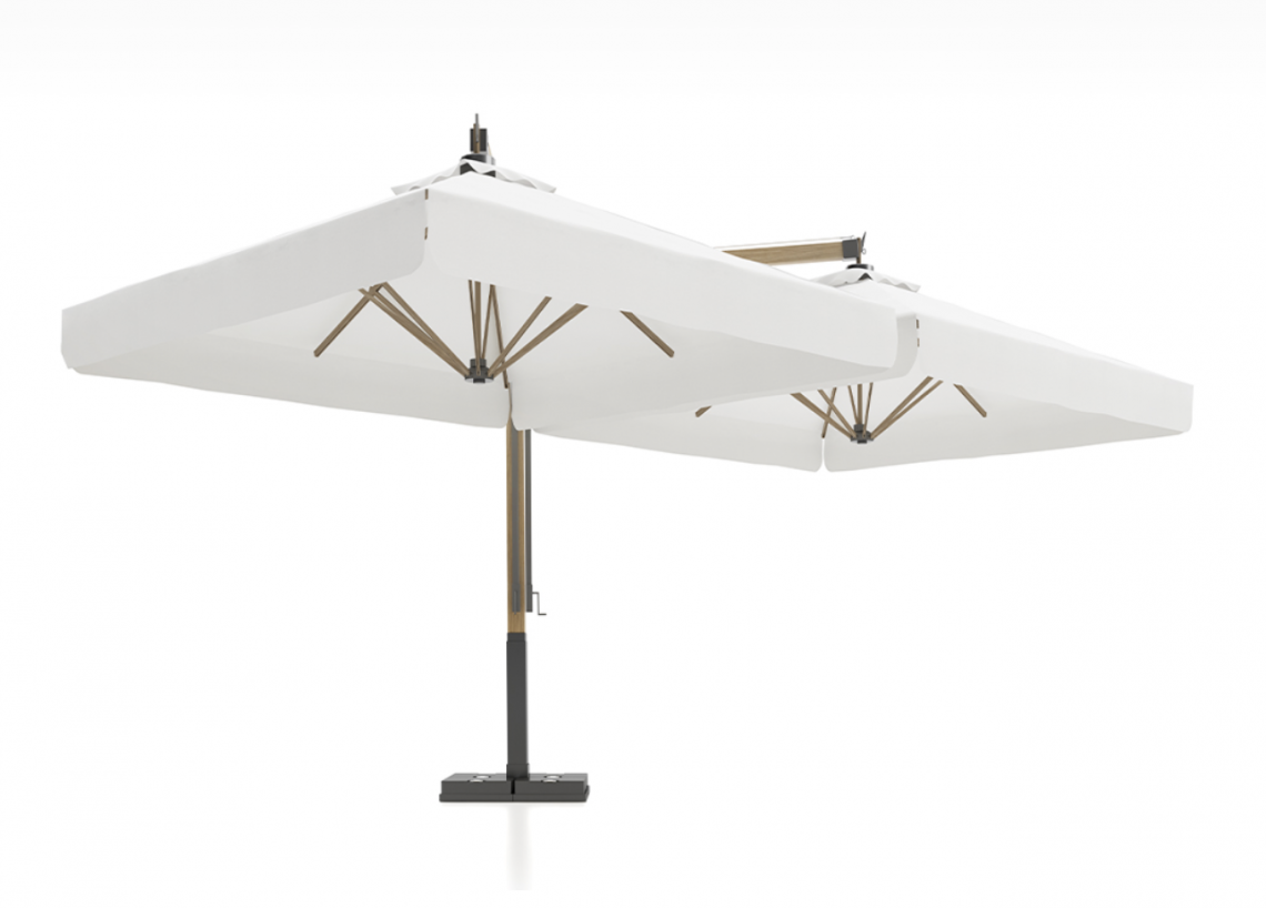 Apertura a manovella per ogni ombrellone, base in acciaio compresa.