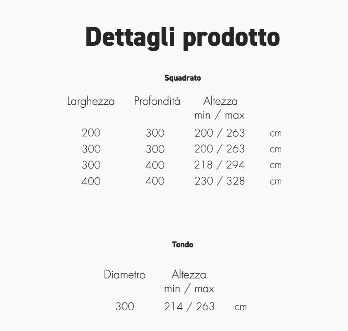Telaio in alluminio verniciato grigio o bianco. Tessuto acrilico gr. 320 in colore bianco o ecrù. Completo di soffietto antivento, apertura a carrucola, corone in resina.