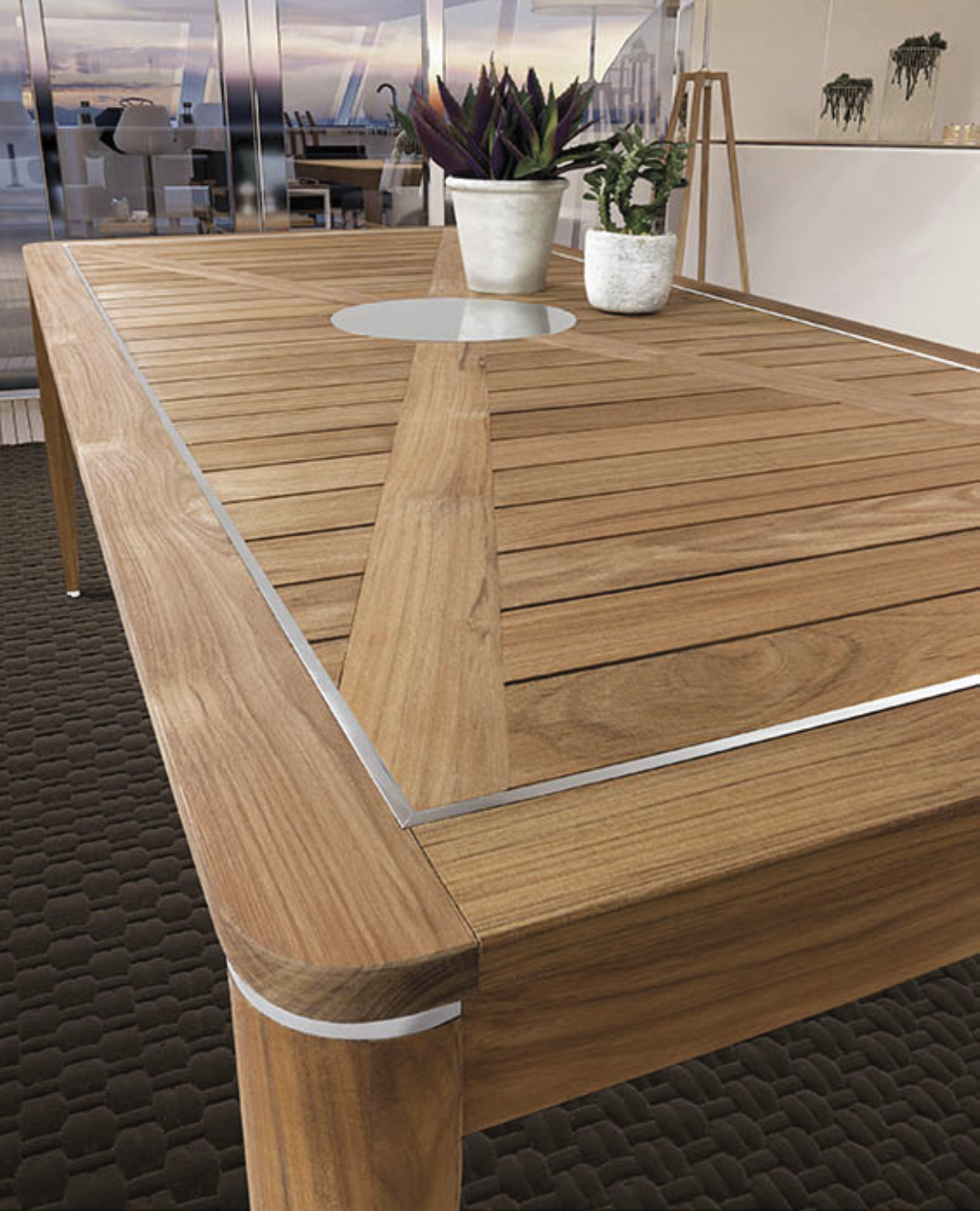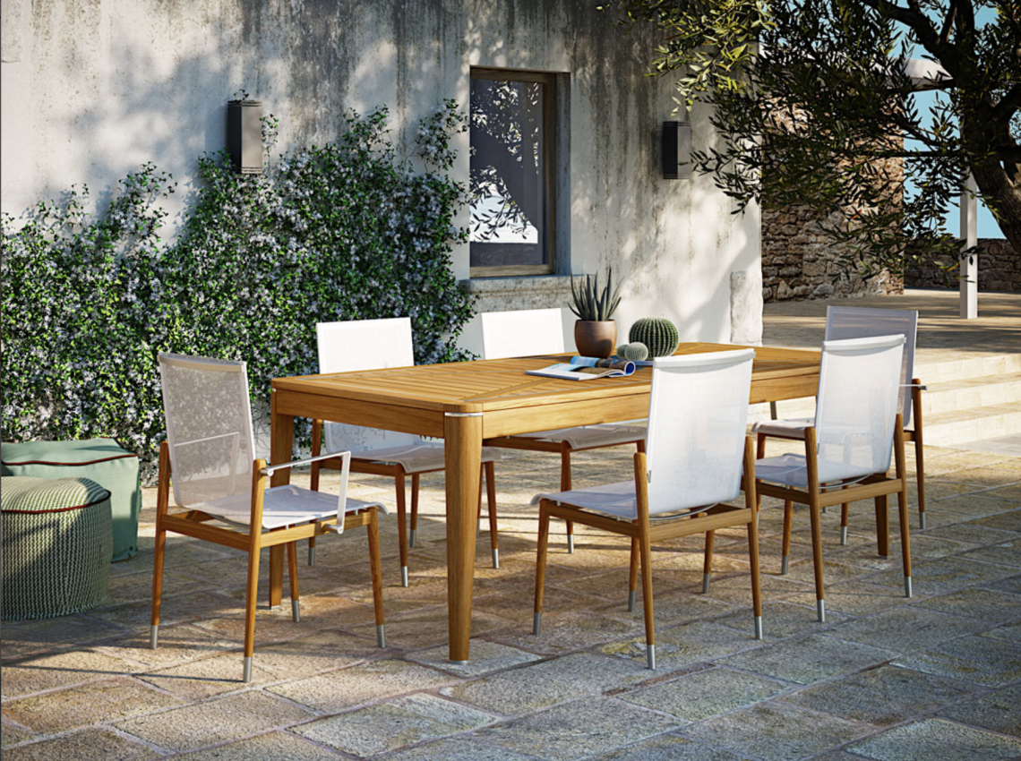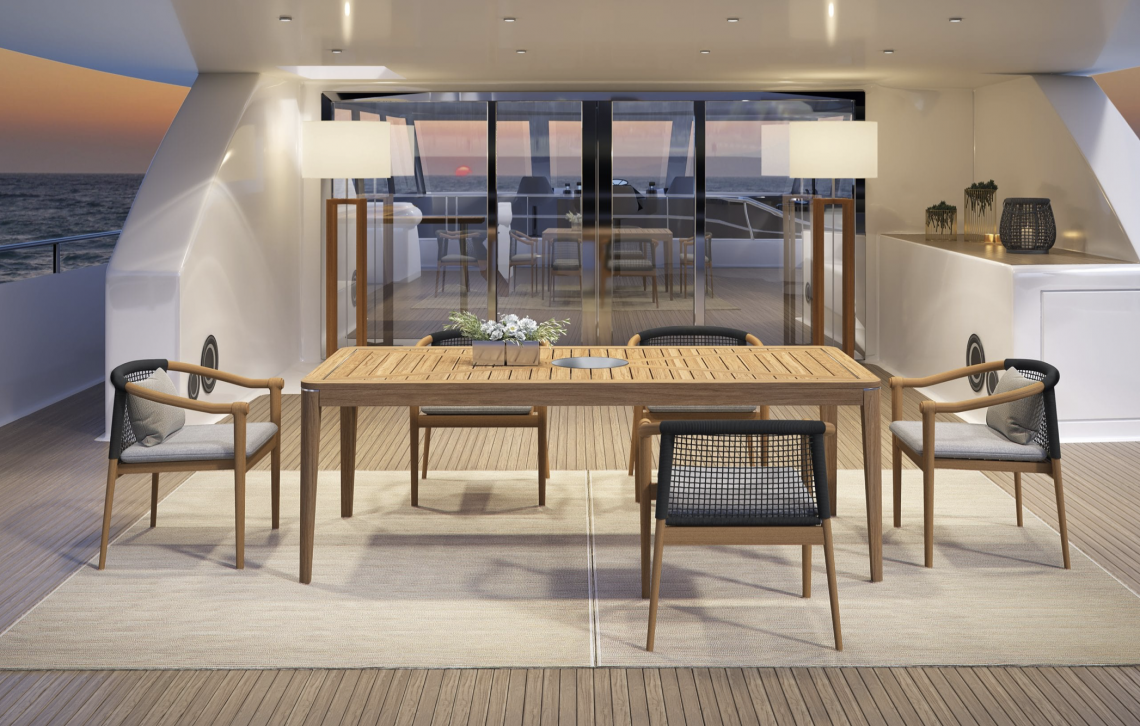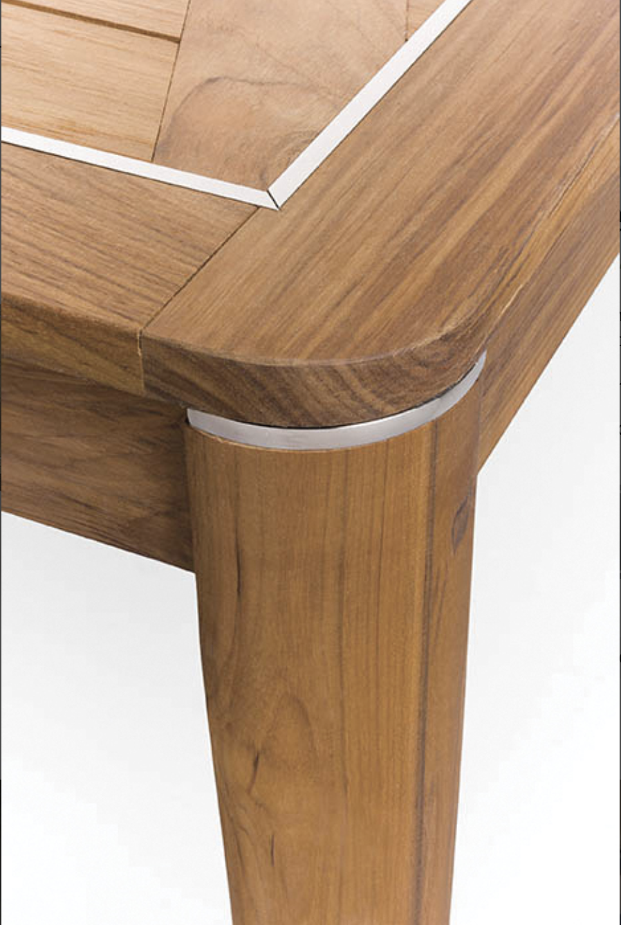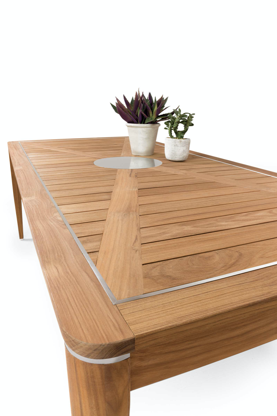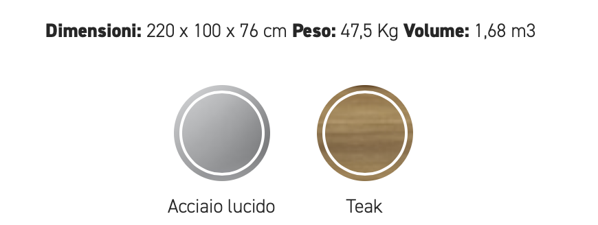 Strutture in TEAK massiccio Asiatico; dettagli in acciaio satinato. Disco in acciaio diametro 32 cm.
