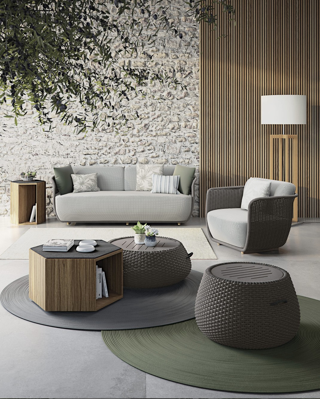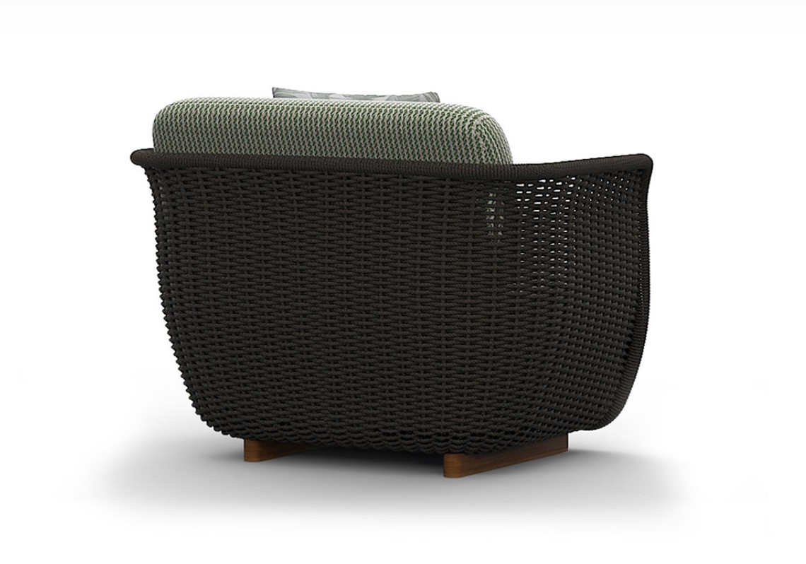 Poltrona con struttura in teak abbinata a corde intrecciate a mano in fibra acrilica di Teflon, a sezione tonda, resistenti all’acqua e di facile pulizia. Il materiale presenta un appeal morbido e raffinato simile ad intrecci tessili. Si caratterizza per la sua resistenza ai raggi UV e per la velocità di asciugatura.