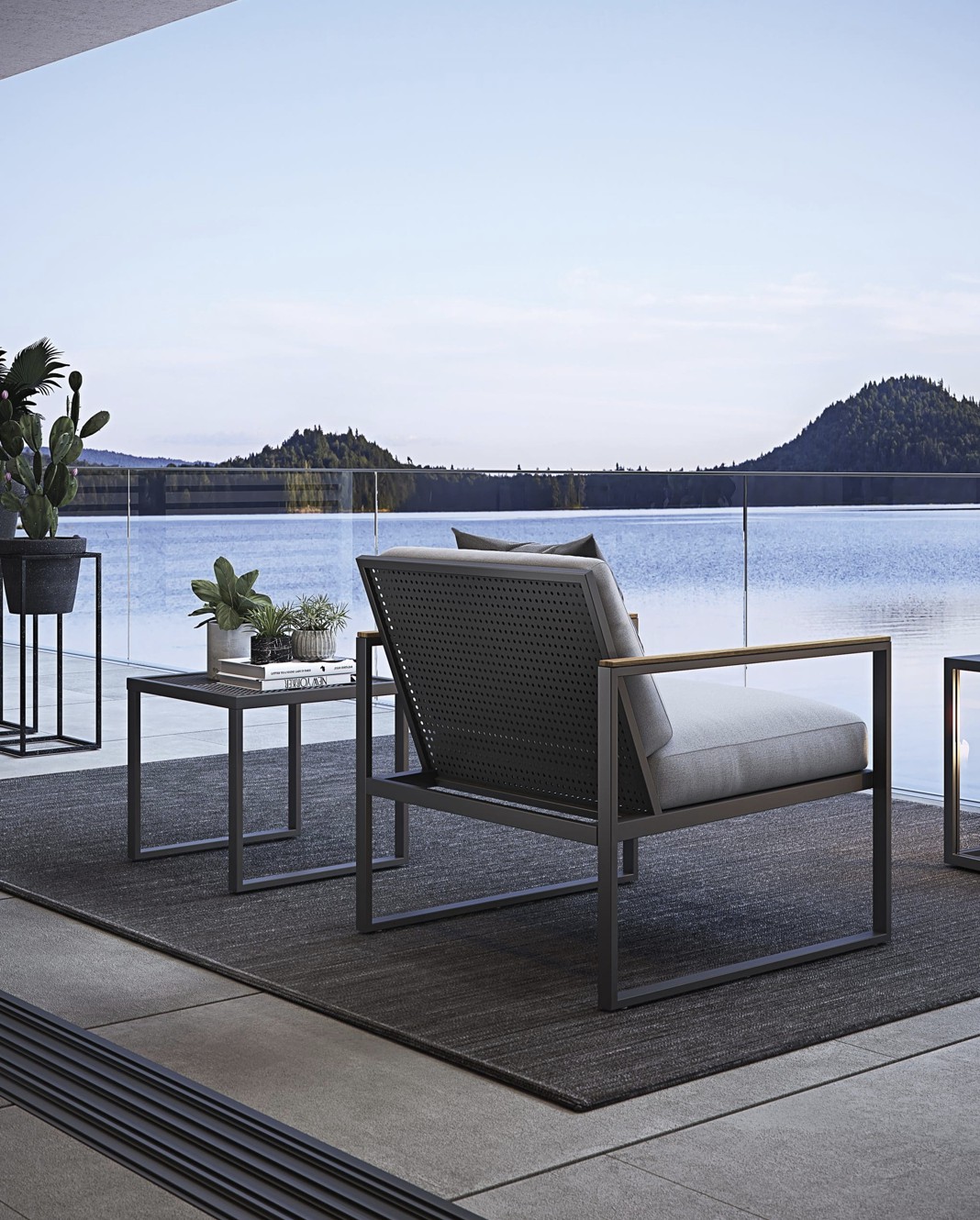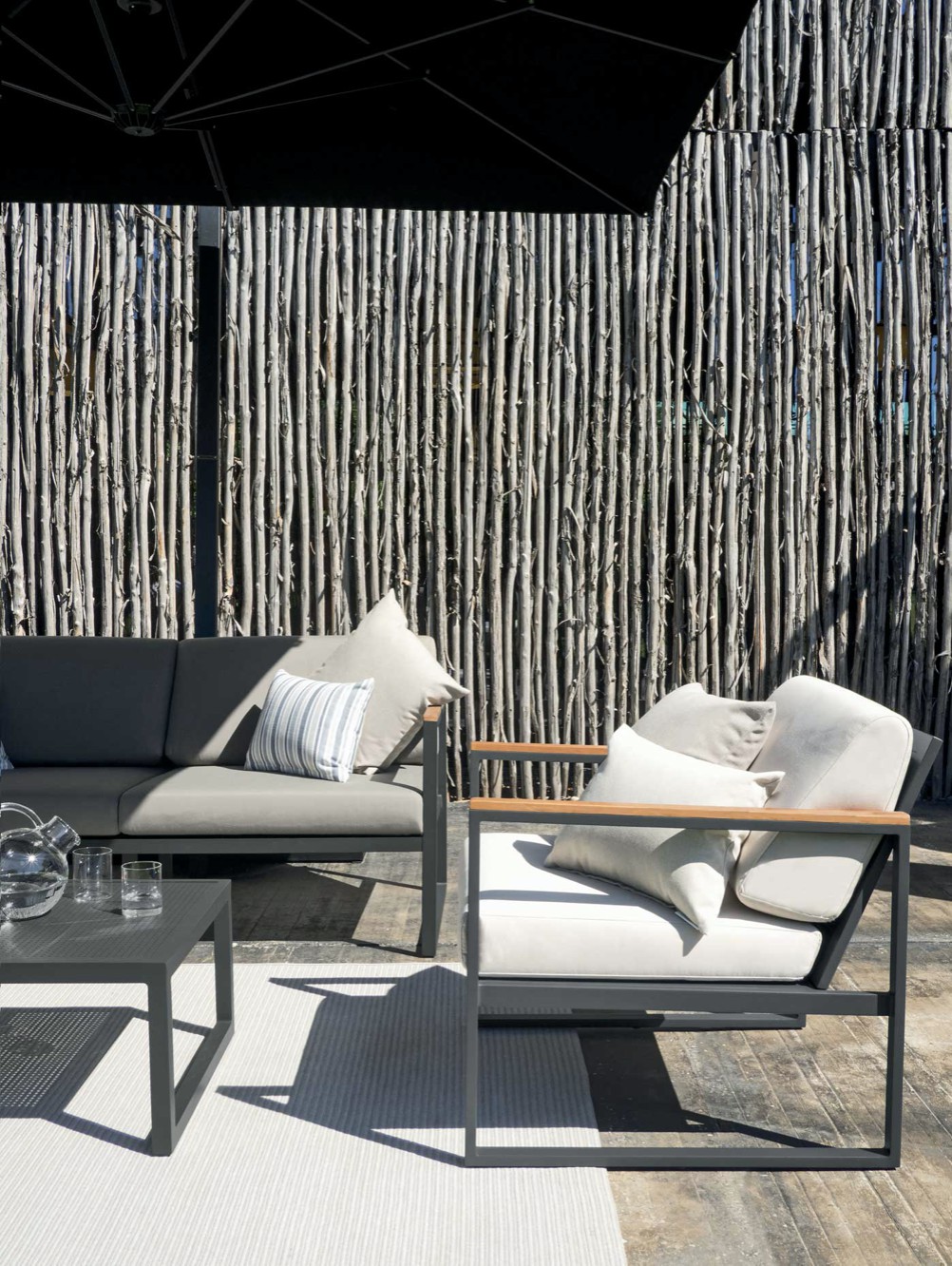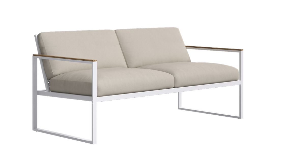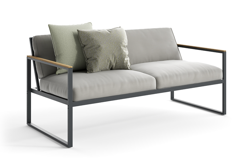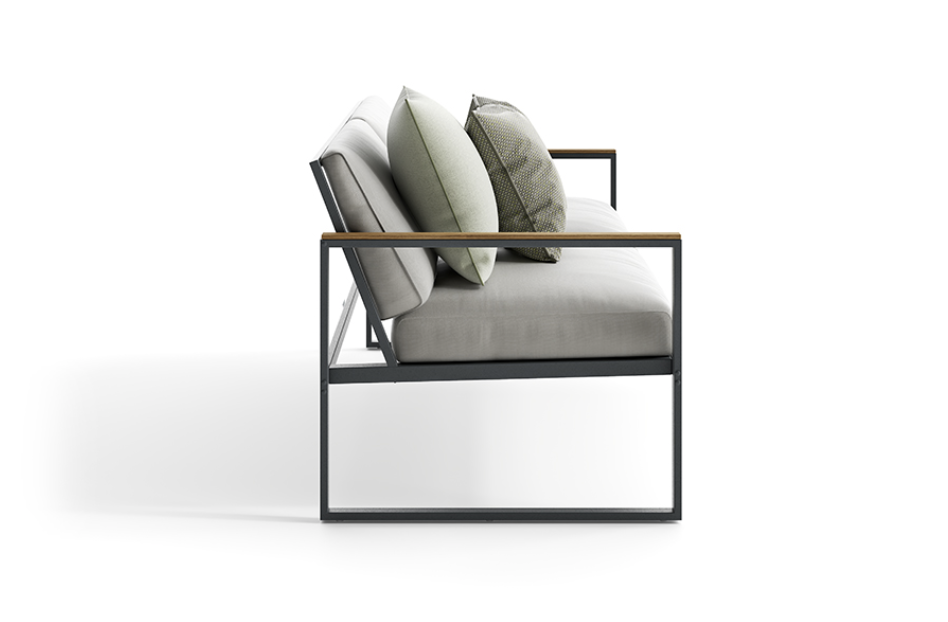 Strutture in alluminio verniciato epossidico per esterni in colore bianco e grafite, dettagli in TEAK Asiatico.