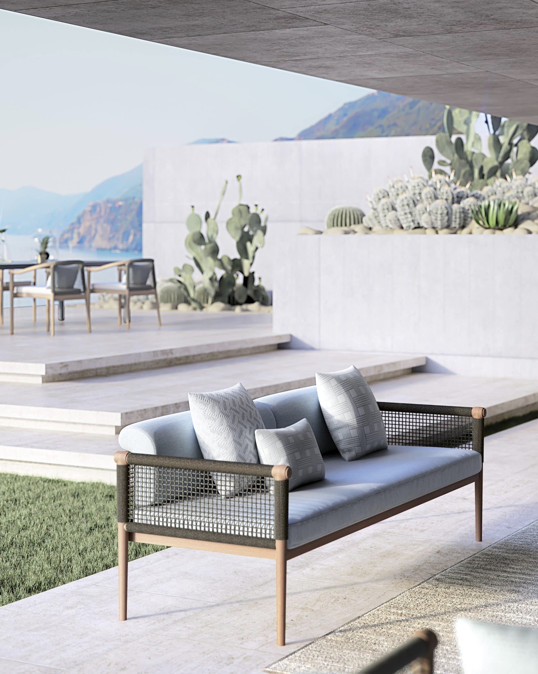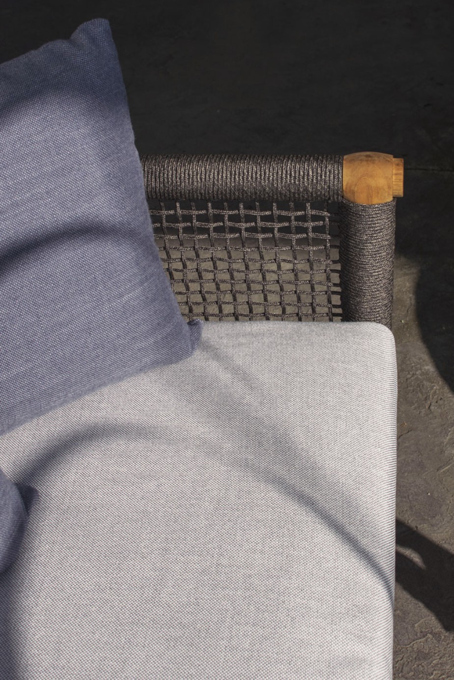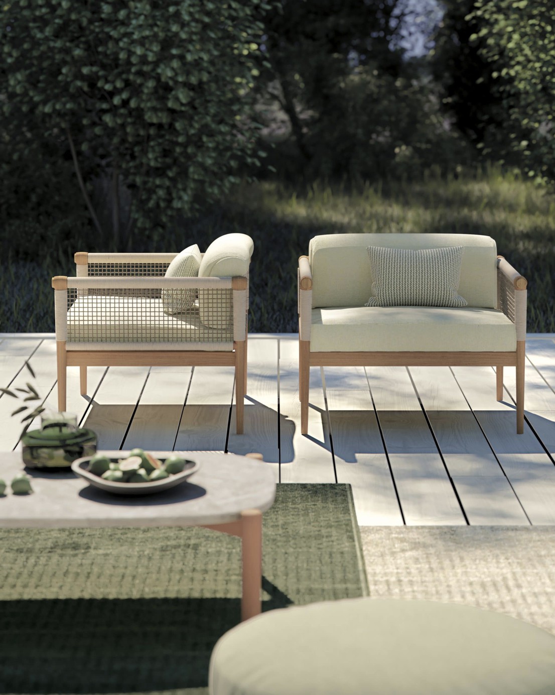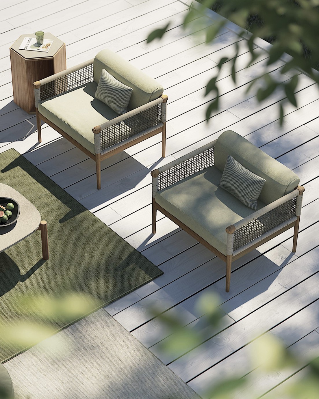 Design pulito e minimale descritto in una struttura completamente in teak intrecciata da una corda rotonda che crea una maglia morbida e di forte tenuta. Un nido accogliente diventa spazio di conversazione e lettura.