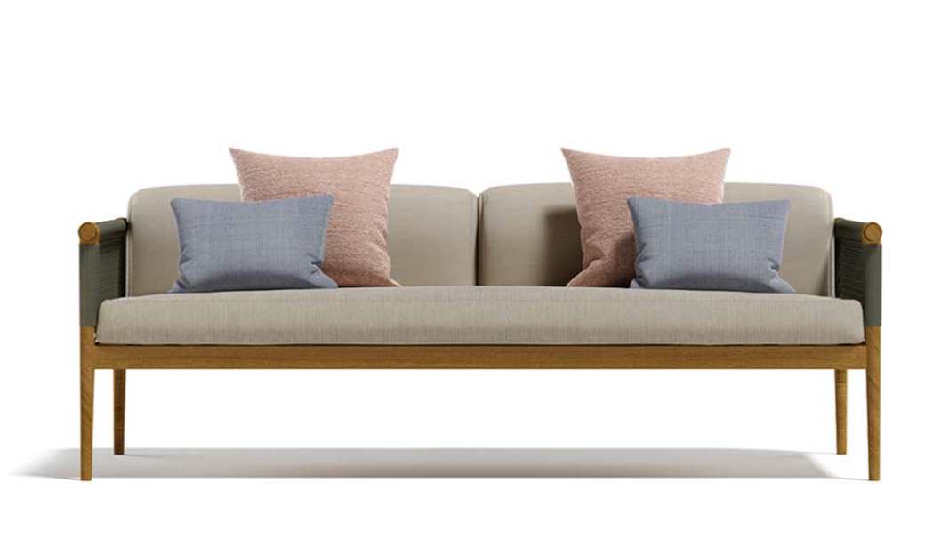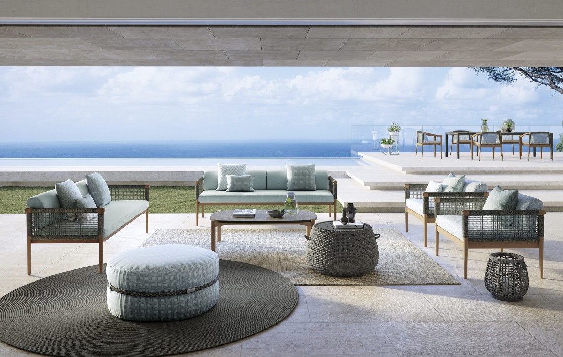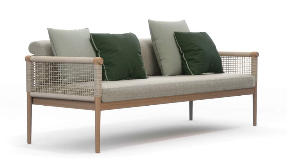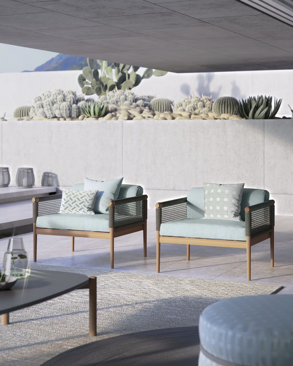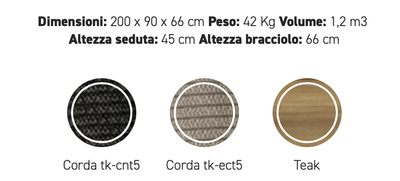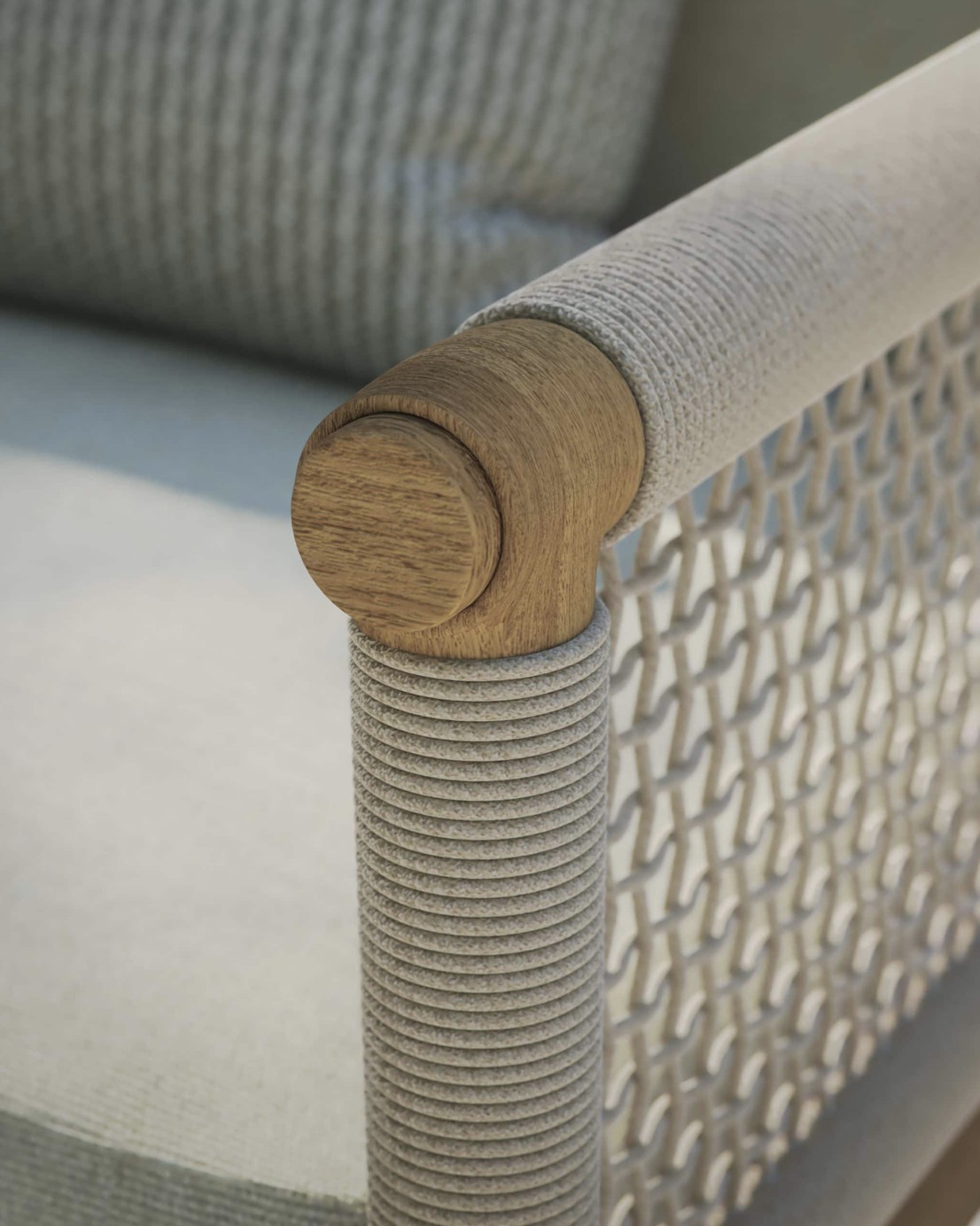 Design pulito e minimale descritto in una struttura completamente in teak intrecciata da una corda rotonda che crea una maglia morbida e di forte tenuta. Un nido accogliente diventa spazio di conversazione e lettura.