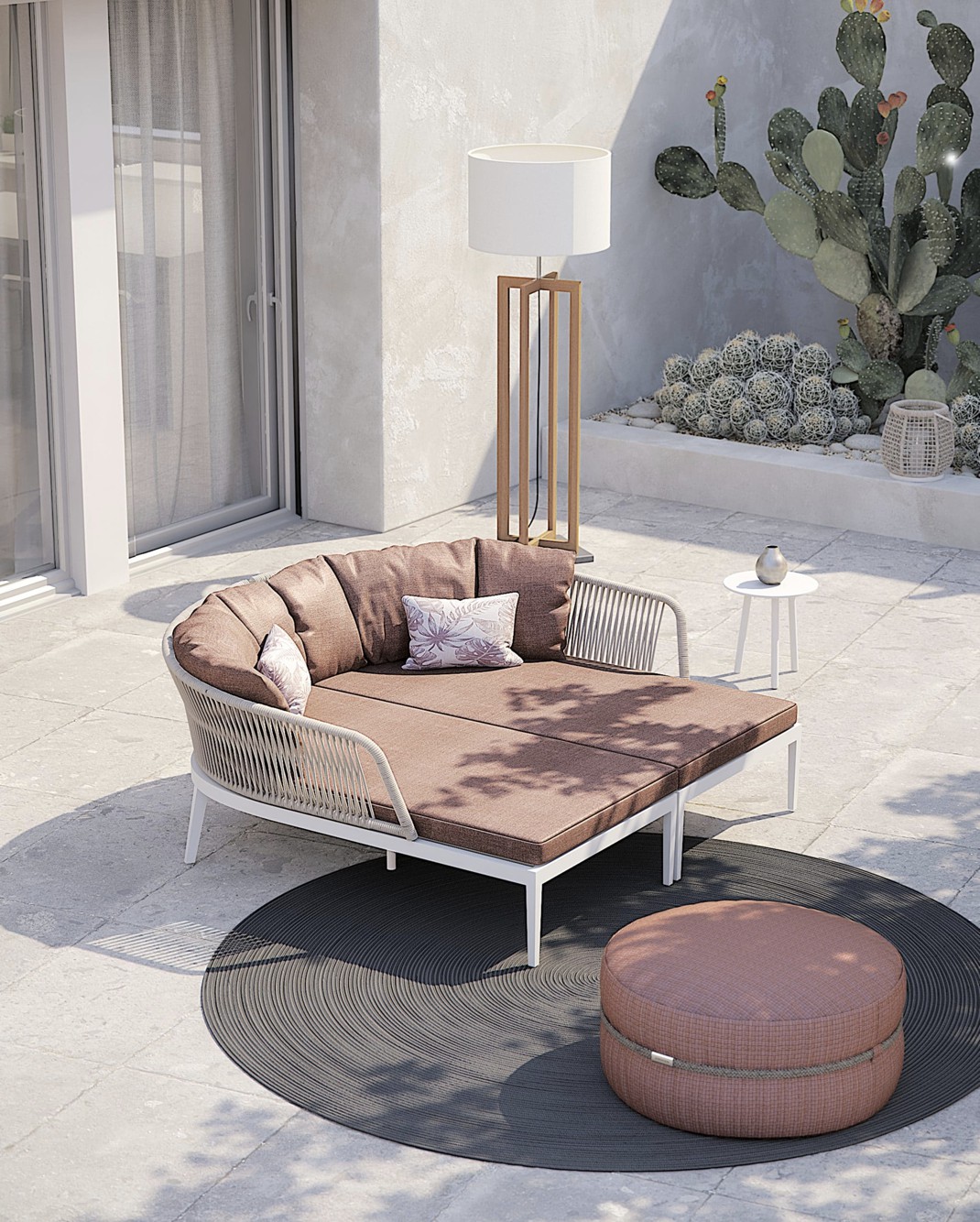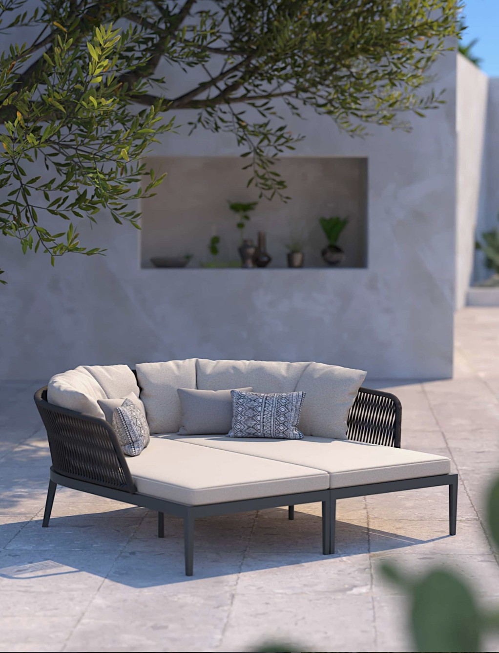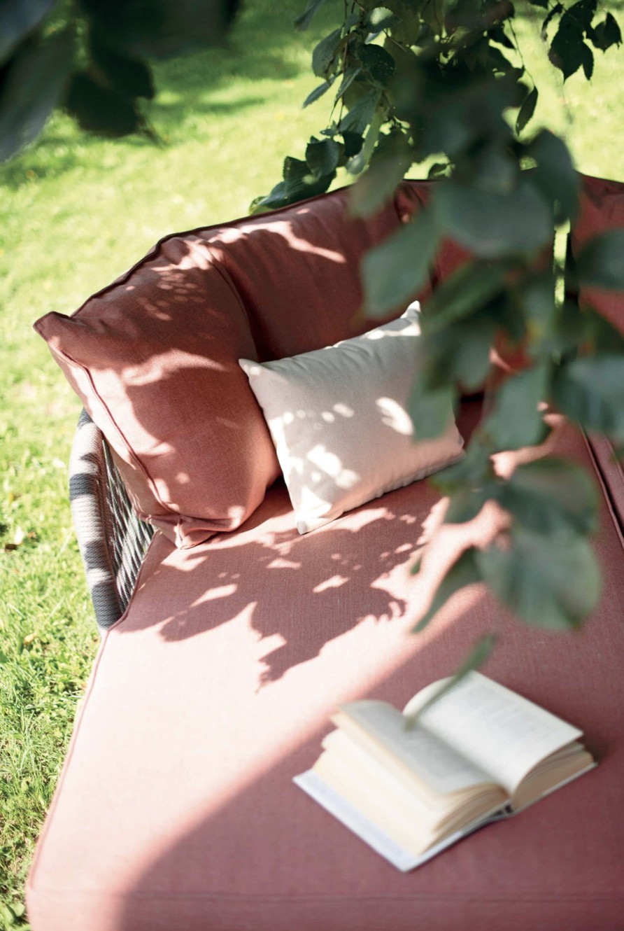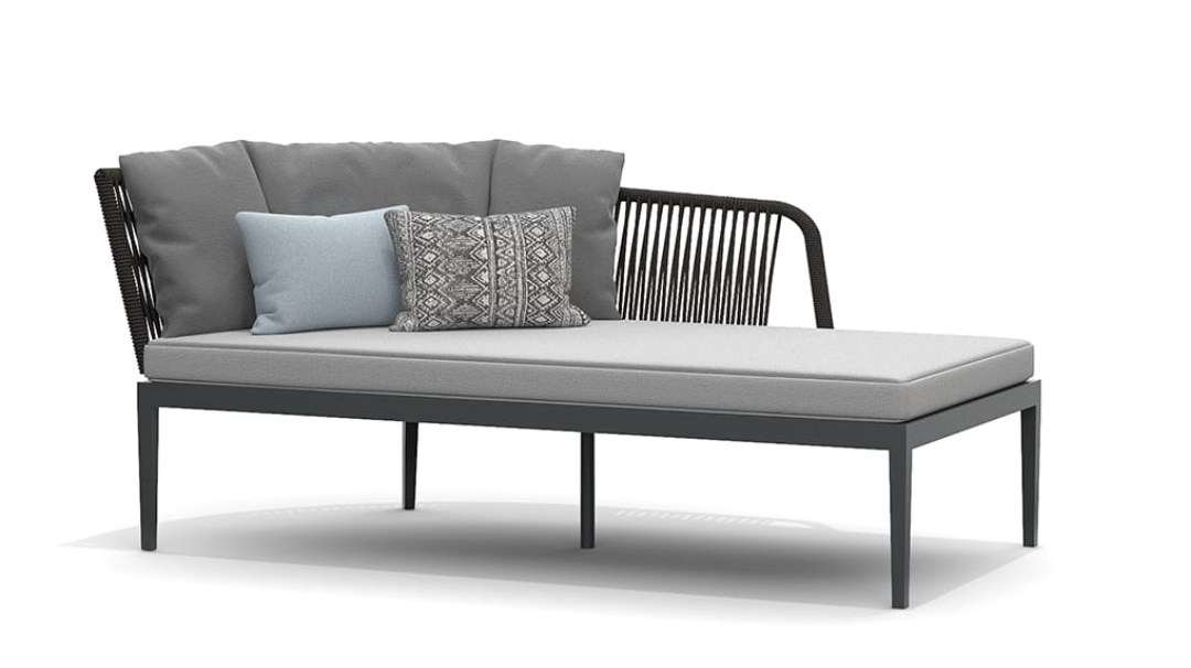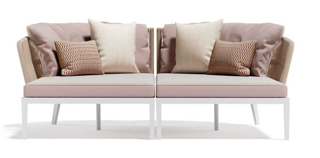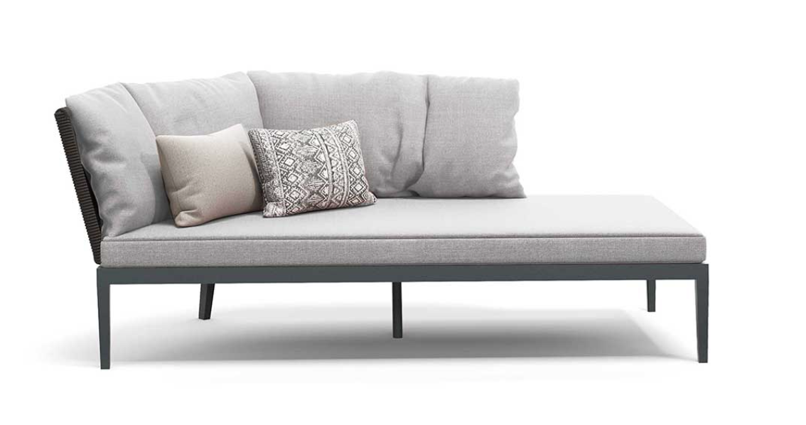 Un carattere signorile ed elegante cela un’anima minimale e giocosa. Fibre tessili sfumano in gradevoli nuances di verdi salvia e oliva che modellano forme morbide e ergonomicamente confortevoli. Una struttura in alluminio bianco o grafite risolve il problema degli spazi ibridi tra in e out coniugando molteplici soluzioni di arredo.