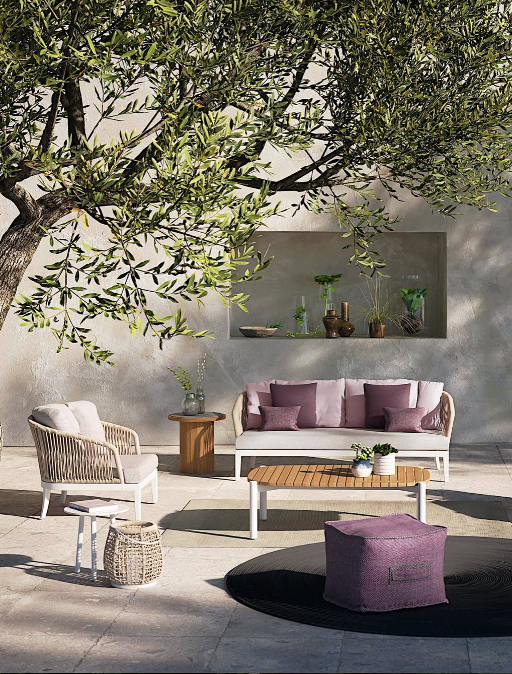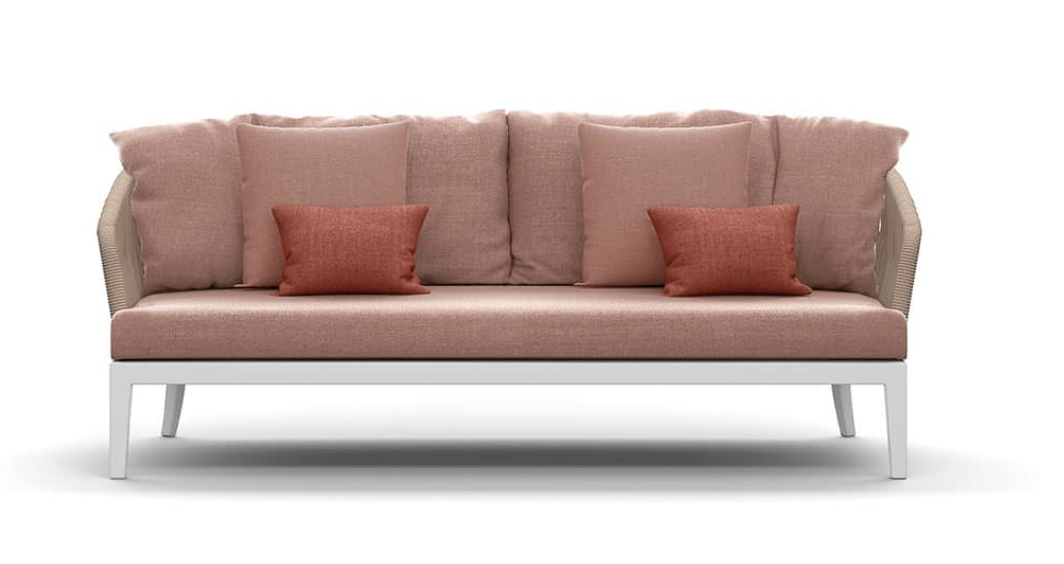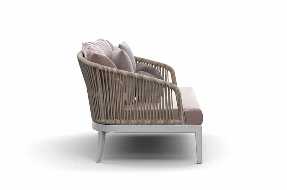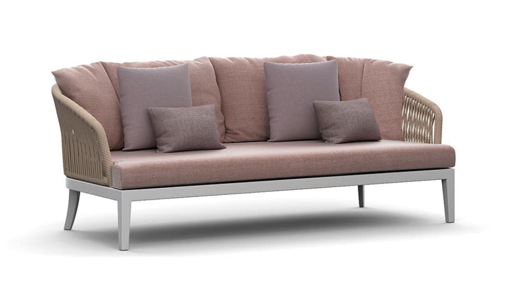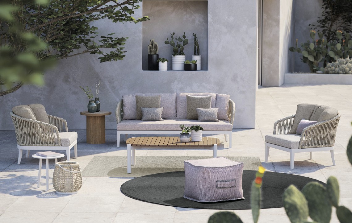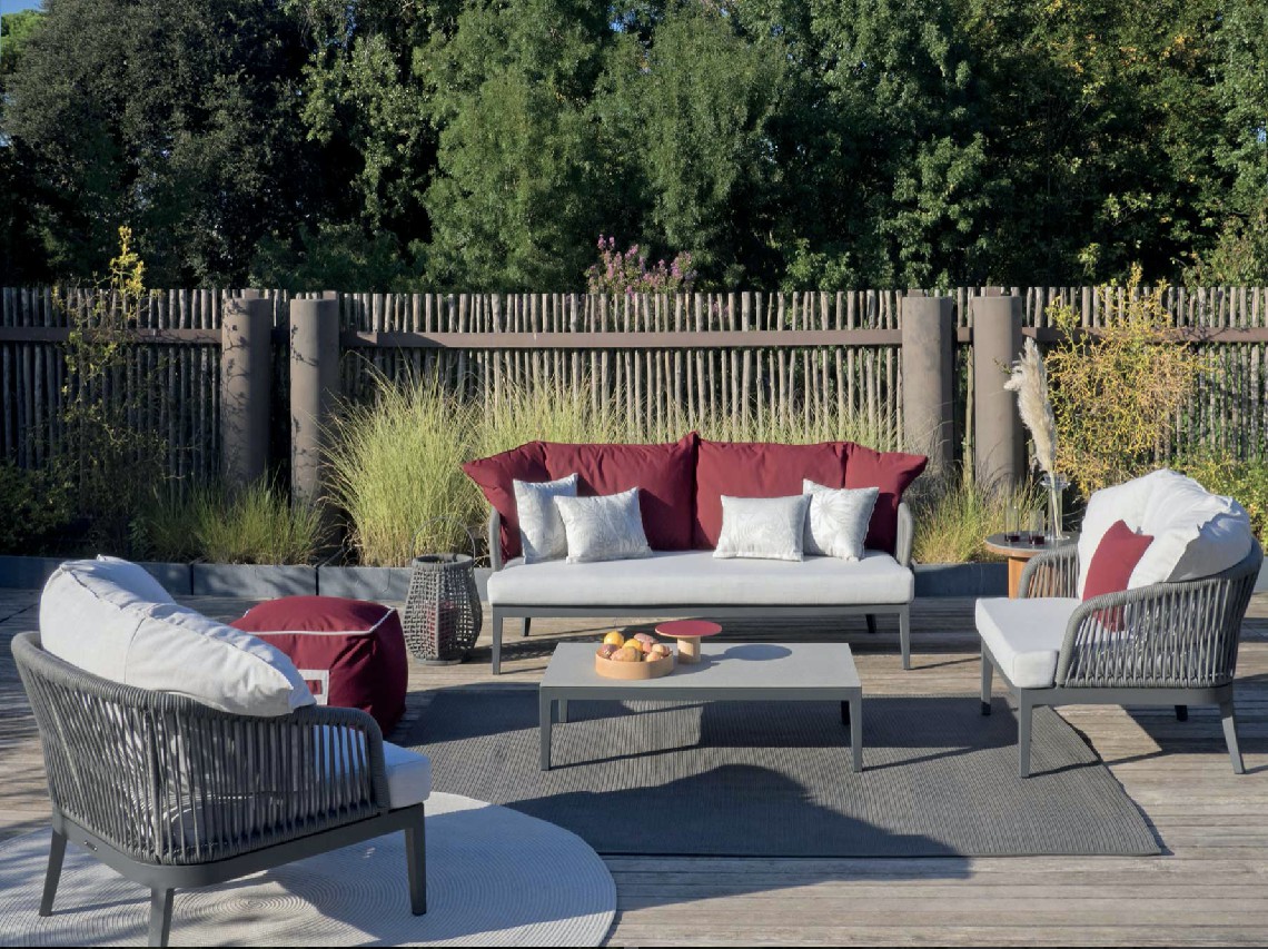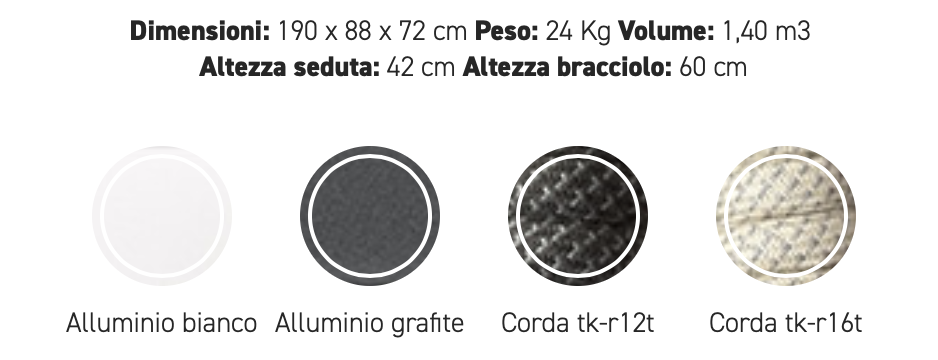 Un carattere signorile ed elegante cela un’anima minimale e giocosa. Fibre tessili sfumano in gradevoli nuances di verdi salvia e oliva che modellano forme morbide e ergonomicamente confortevoli. Una struttura in alluminio bianco o grafite risolve il problema degli spazi ibridi tra in e out coniugando molteplici soluzioni di arredo.