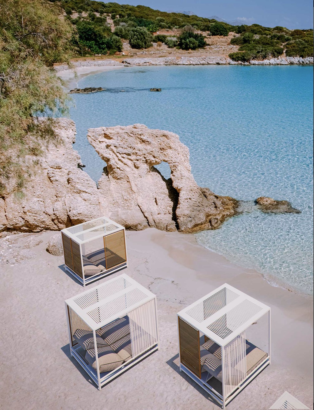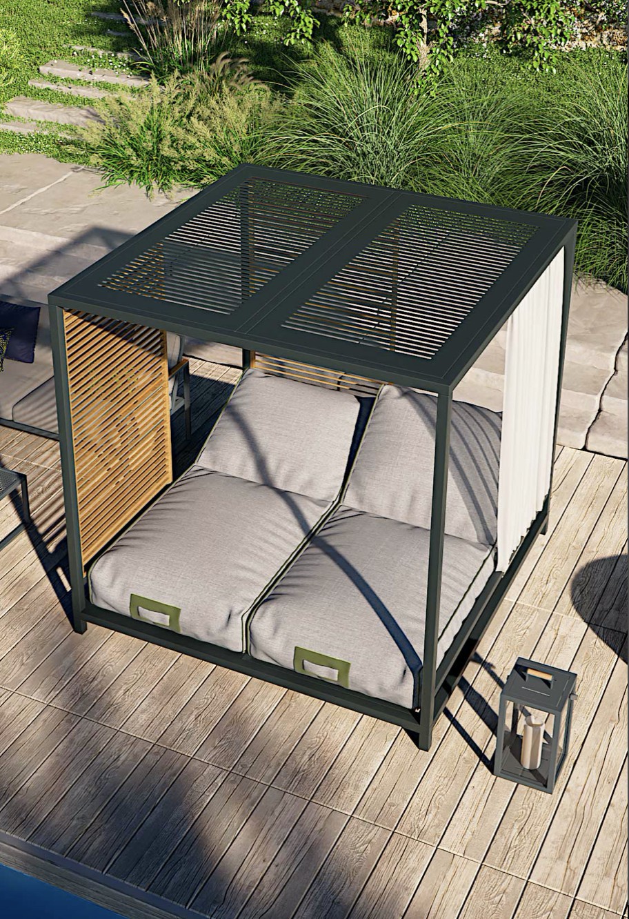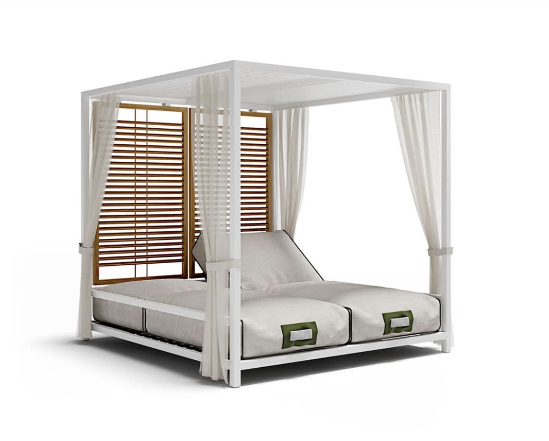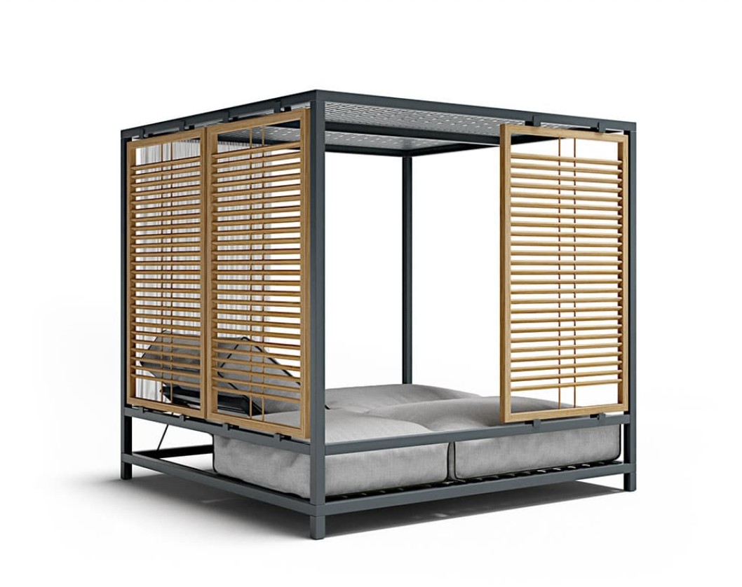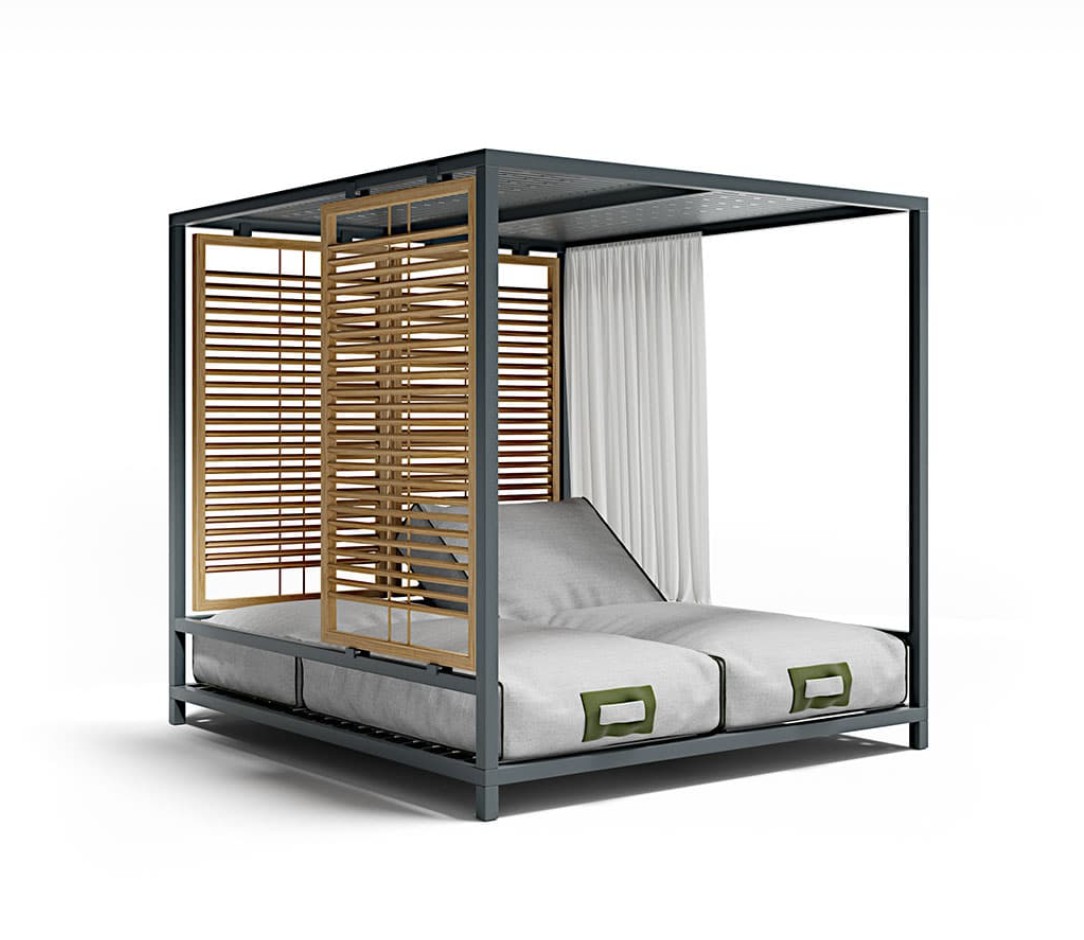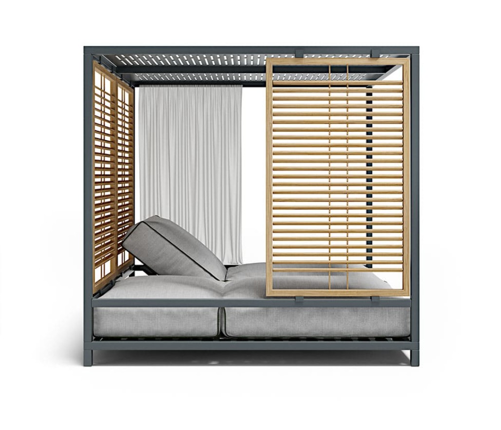 Alcova è stato progettato come uno spazio ibrido e coperto ma comunicante con l’ambiente esterno e la natura. Una struttura in alluminio robusta ma confortevole, un sistema di pannelli modulari in teak che riparano senza oscurare, una cuscinatura accogliente e ergonomica dove ritrovare una dimensione unica in cui spazio e tempo battono secondo i tuoi ritmi.
