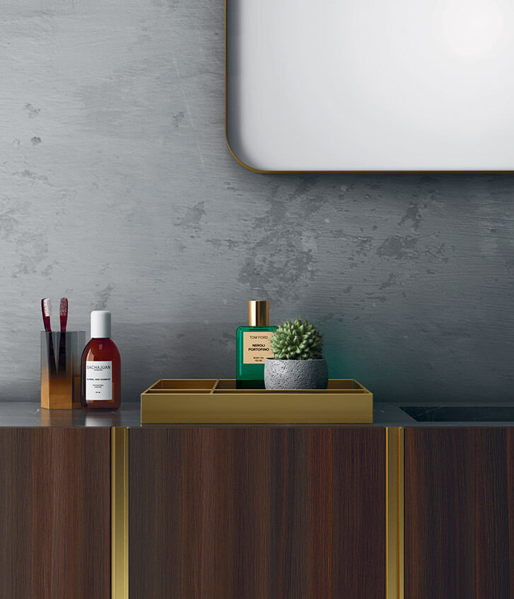 Like a precious piece of furniture, the warm and sophisticated effect of Eucalipto Termocotto envelops the wall-mounted unit, enhanced by the brilliant touch of the brass door handles. Sophisticated, classy element: the top in Pietra Grey.