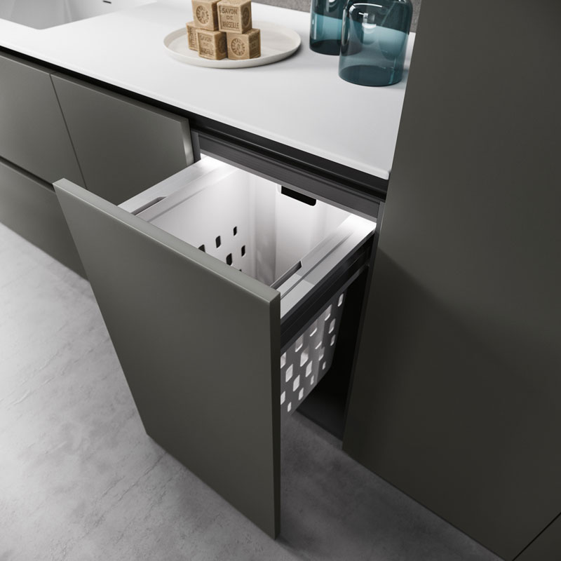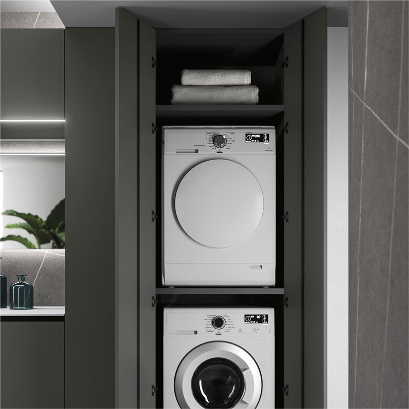 The 2-door tall unit is equipped for the installation of laundry appliances. The large pull-out laundry basket is removable to facilitate cleaning.