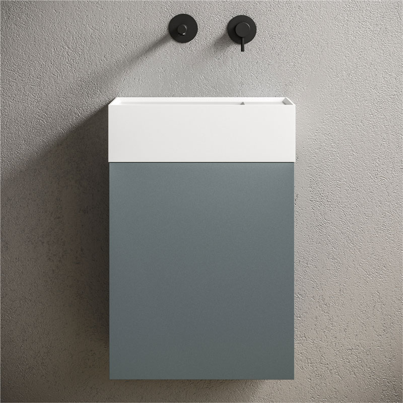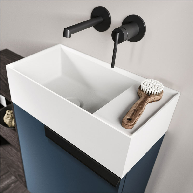 Available in both Mineral Sand and Mineral Lux. It can be installed alone or supported by a practical and dedicated storage unit, in matching or contrasting colours.