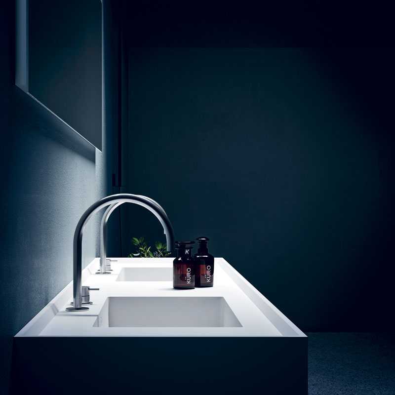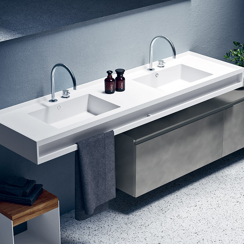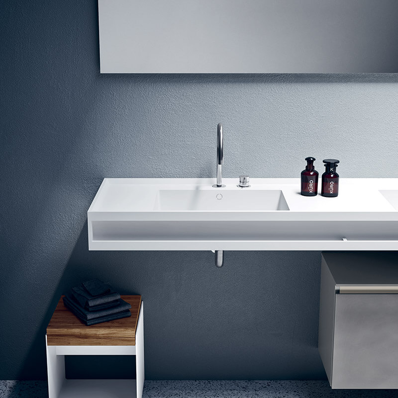 A composition dedicated to linear and orderly simplicity, horizontally developed with just three elements arranged at staggered heights. Each is a distinct volume, with its own function: top with double basin, base with pull-out drawers for storage, mirror with integrated lighting.