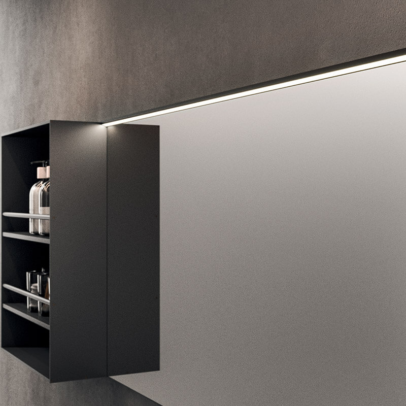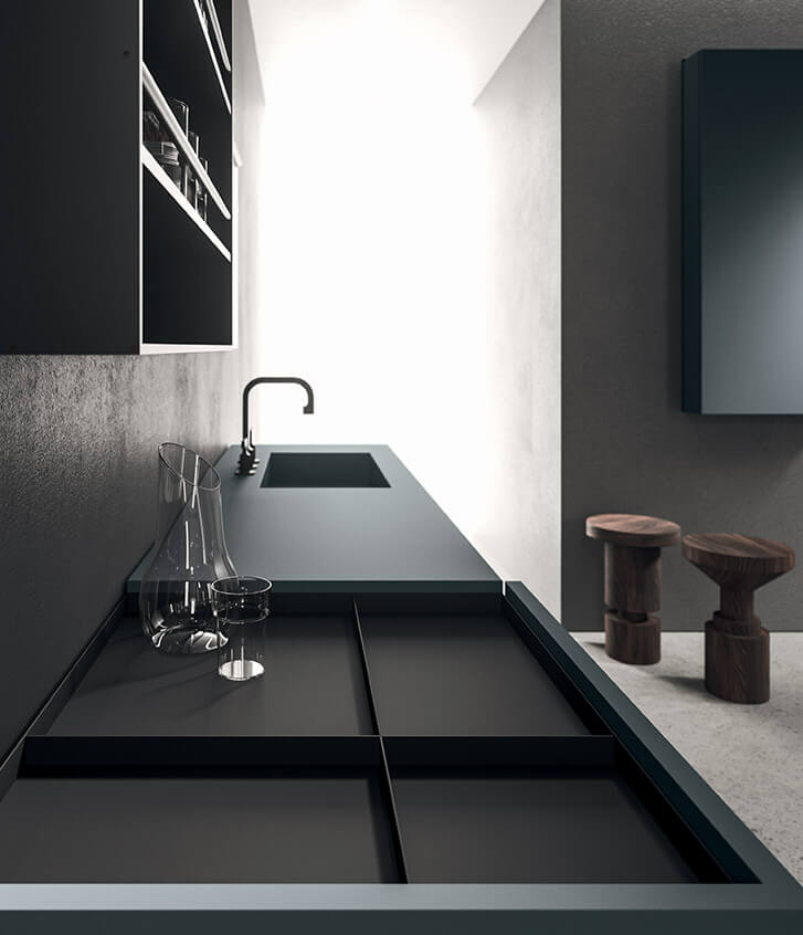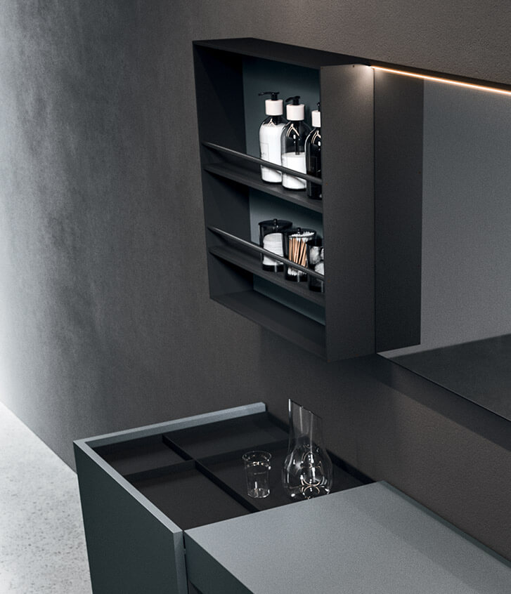 Plays on volume, full and empty spaces; this particular composition made entirely in Fenix NTM? Grigio Bromo, includes the Lympha pull-out end module with open side compartment, and integrated basin in the top in Fenix NTM?.