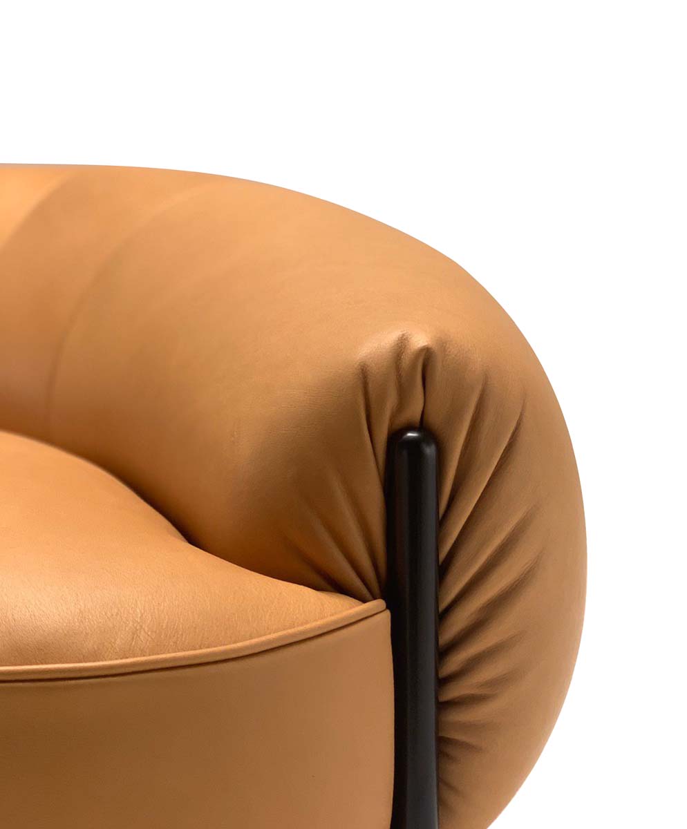 I pouff, echeggiano la forma della poltrona e del divano, creando una meravigliosa sinergia tra i vari pezzi.