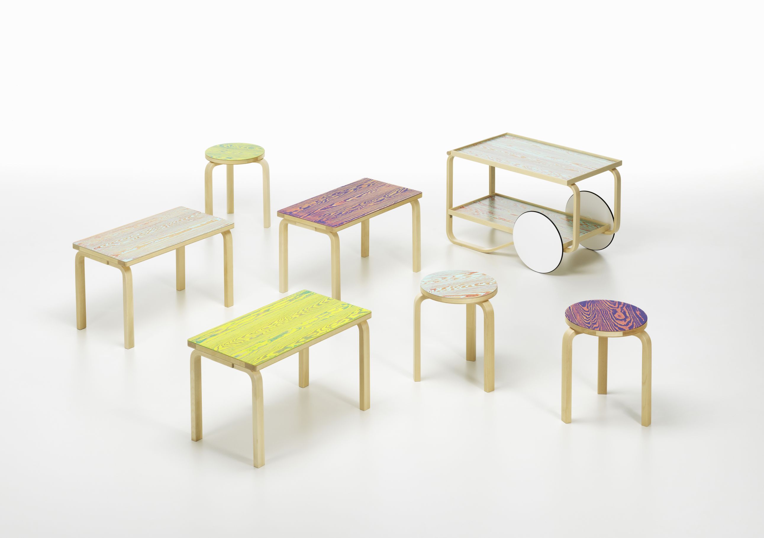 Jo Nagasaka的新穎傳統手工藝以其新穎和現代的表現而聞名。因此,總部位于東京的建筑師和設計師是Artek的FIN / JPN友誼收藏的自然伴侶。長坂(Nagasaka)著手將他在表面處理方面的研究應用到Artek最受歡迎的經典作品中。 Nagasaka嘗試了Udukuri和Tsugaru-nuri的古老做法,將它們合并到自己的原始流程中,從而產生了他所說的ColoRing。對于ColoRing,軟木松木用作表面貼面。長坂通過用硬毛刷去除較軟的部分,從而突出木材的天然紋理(Udukuri),從而使木材表面不平坦。然后添加兩層有色漆,隨后將其打磨以部分暴露下面的層(Tsugaru-nuri)。結果是令人驚訝的顏色組合和不規則的圖案,讓人聯想起地形圖。保留部分可見的木制結構,保留自然美景,同時創造出迷人的并列感。為了生產ColoRing系列,Artek將這些傳統上完全手工的技術轉化為半工業工藝,從而使該系列能夠帶給更多的聽眾。使用ColoRing技術處理過的Stool 60,Bench 153B和Tea Trolley 901在芬蘭制造,在世界范圍內都有銷售。