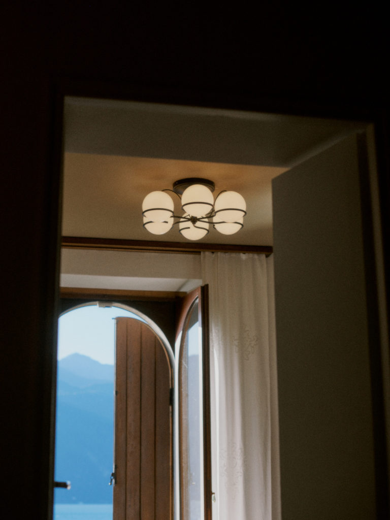 With Le Sfere Plafone, Model 2042/6 from 1963, another of Gino Sarfatti’s beautiful interpretations of the luminous sphere is reintroduced. The refined ceiling light is composed of six blown opaline glass spheres supported by a painted steel mount and structure with a Black or Champagne finish. Each sphere measures 20 cm in diameter and is gently held in place by the painted steel ring in a refined embrace that lends the luminaire a graphic expression and brings forth Le Sfere’s distinctive aesthetic.