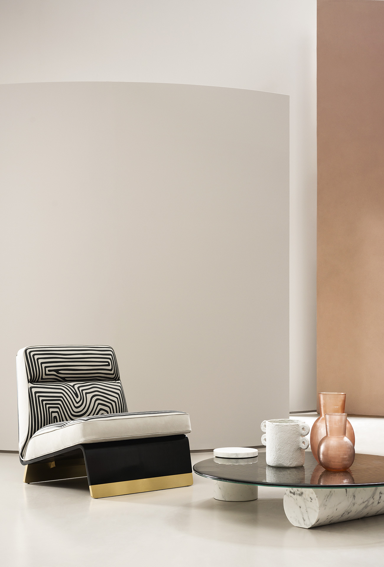 Frame in ash veneered wengé-stained beech plywood, shellac finish and borders in satin-finished brass,in hand-finished burnished metal or in satin nickeled metal, with matte varnish. Differentiated density polyurethane foam filling with acrylic fibre covers.