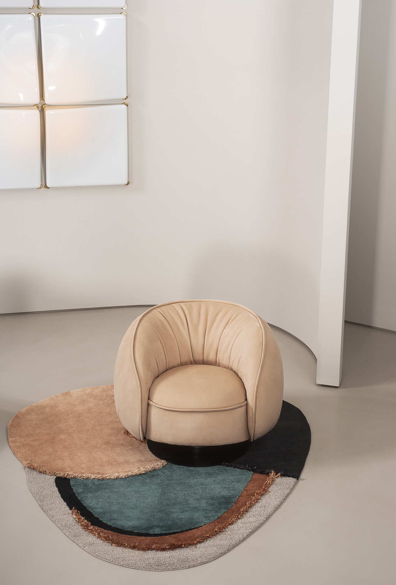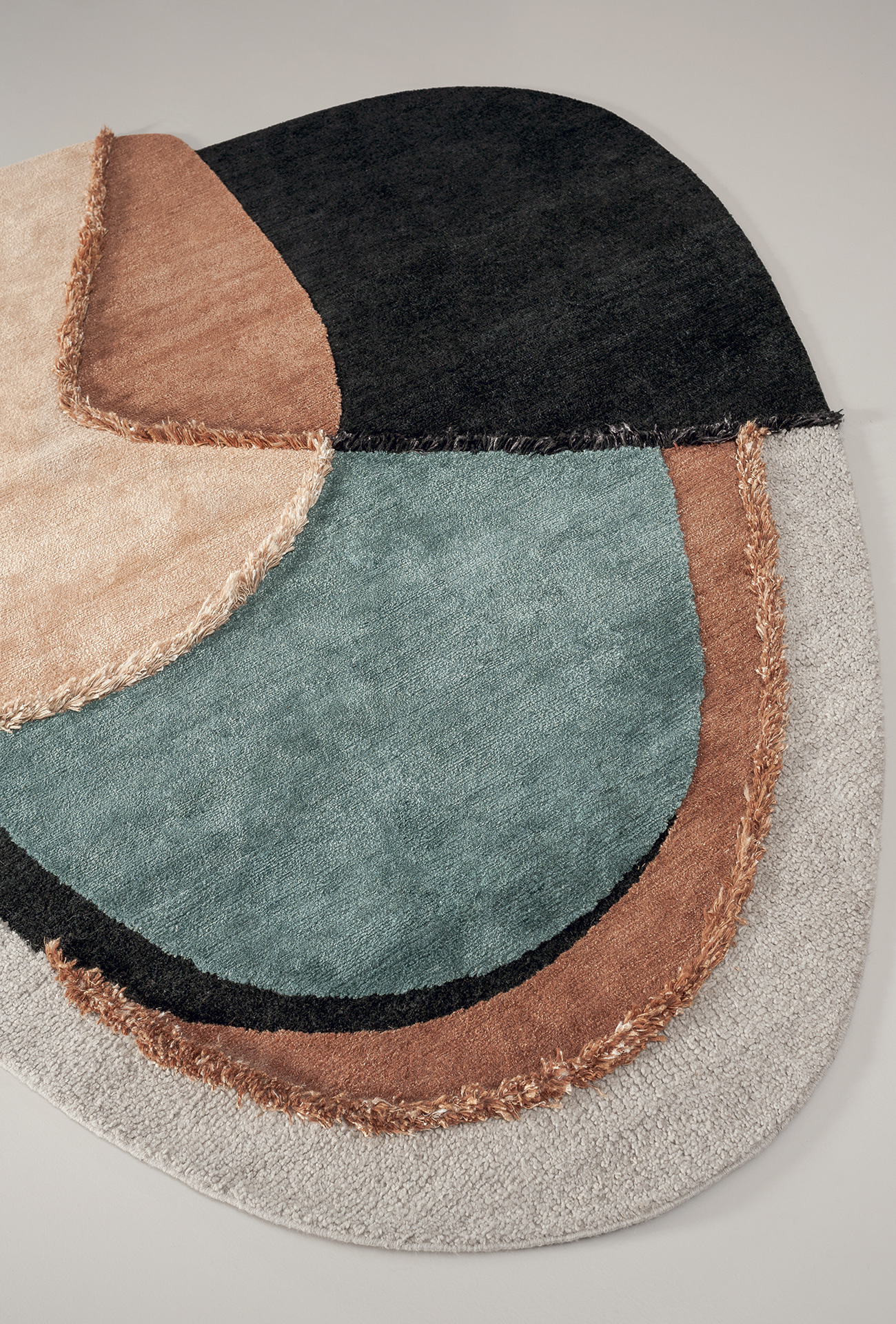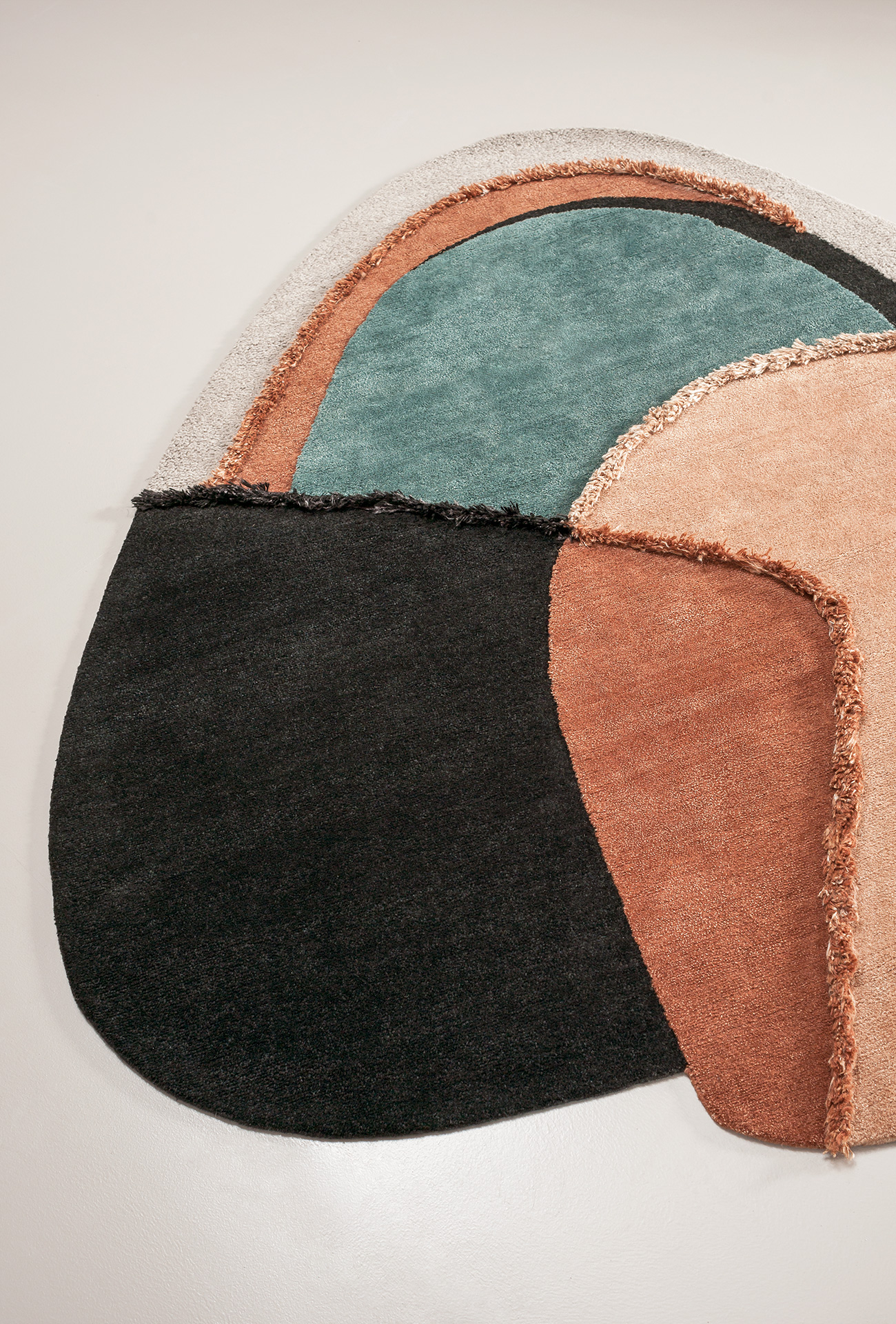 Himani is a collection including 3 iconic rugs produced in limited and numbered series. A combination of irregular shapes. Each rug is characterised by a series of contrasts: texture, three-dimensional elements, uneven surfaces matched with smooth ones, they are all interrupted by a series of organic lines, that give a note of contemporary. Glossy and matt effects, given by the contrast of vegetable silk and wool, react in a different way to light; thanks to light, the refinement of colour combinations in every section of the rugs can be subtly perceived. The different heights of the fleece (“shaggy” on purpose and meticulously hand-finished by expert craftsmen) are softened by more refined parts and complete every rug, adding a touch of elegance.