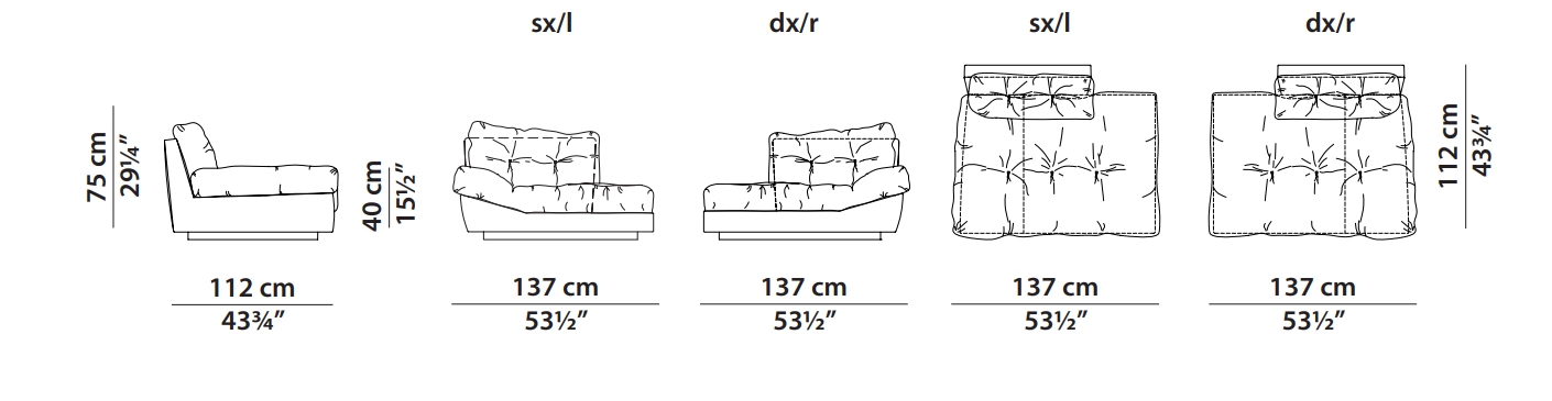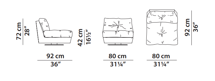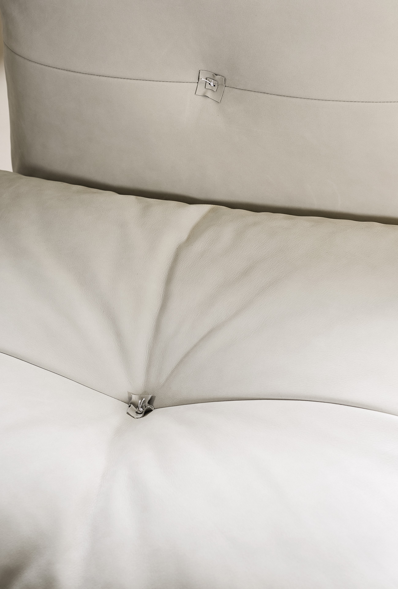 Structure in phenolic plywood and fir essence. Differentiated density polyurethane foam filling with acrylic fibre covering. Decoration with same colour leather and matching or white/red yearn. Sofa and asymmetric armchair with base in matte black-varnished tulipier wood. Armchair with revolving base in matte blackvarnished metal.