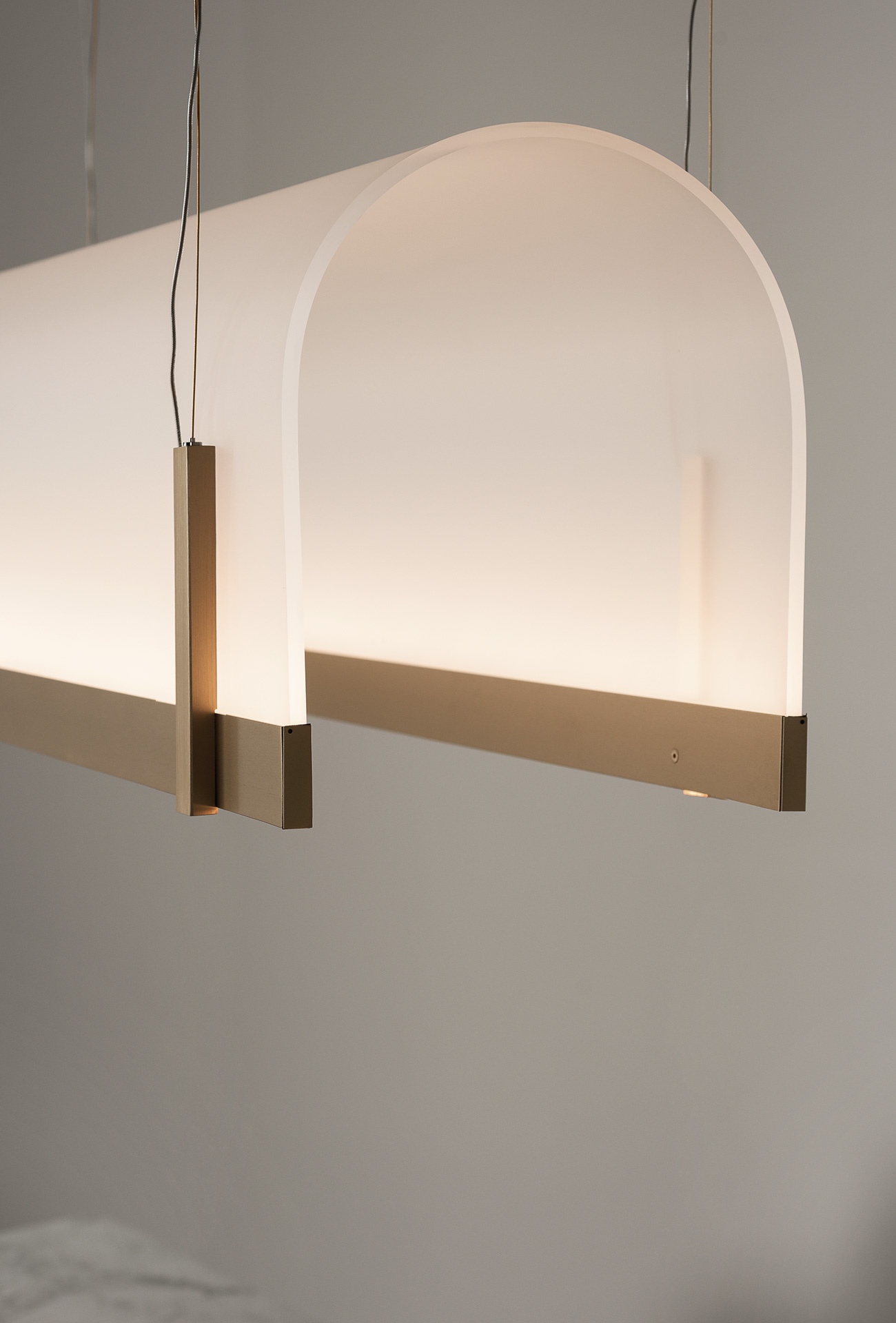 8 mm thick lampshade in printed curved methacrylate. Profiles and details in satin brass-coated metal with matte varnish. Lamp with 2700K led light source.
