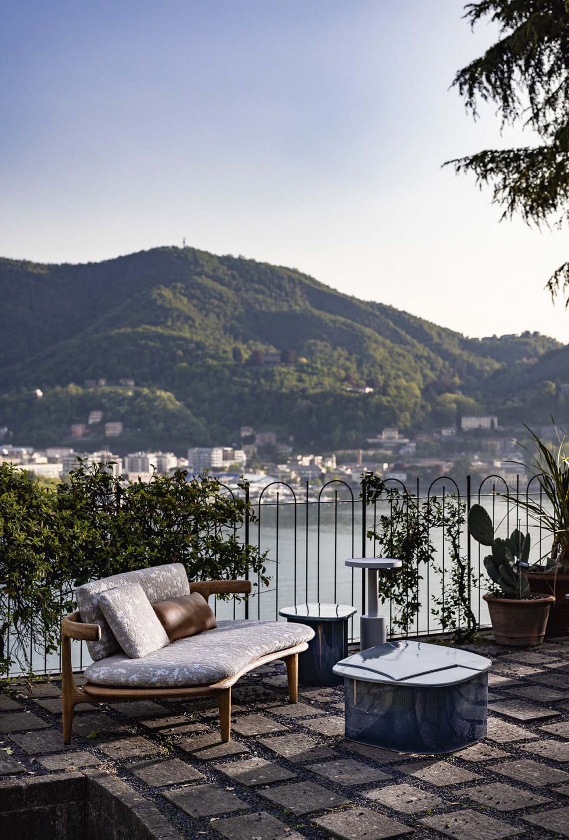 The enamelled finishes, in the Avio, Prune and Sucre shades, blur the gentle reliefs of Keramiké’s profile into light blue mimeses of air and water, brimming with earth and quick off the mark in the greens of the vegetation. Each, in turn, available in three different shades, from the lightest to the most intense, they increase the range of possibilities with which these tables can coexist with their surroundings.