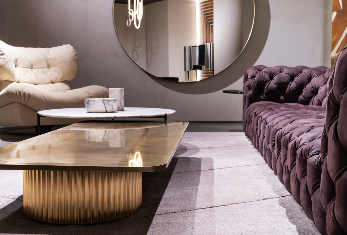 In the grooves of the solid base, we glimpse the reflection of Doric columns, a functional and stable rigour which, on closer inspection, also recalls the more conceptual architectural experiences of 20th-century northern Europe. The handmade workmanship makes each table unique; the varied surface of the top, sometimes smooth and mirrored, sometimes oxidised, accompanies us into a dreamlike dimension. We glimpse moving, almost holographic images of the world we know, dense shadows and shades, ever changing.