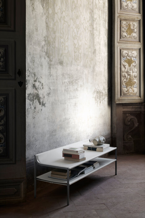 Quiet Lines, a transversal collection consisting of writing desk, bench, bedside table, and screen, is the result of research into serenity by Gabriel Tan and B&B Italia. The silhouette of each collection piece is made up of curved and straight lines, with a striking graphic mark. The curved surfaces upholstered in leather provide tactility and comfort and muffle the sound of objects as they are placed on the shelves. The bench, a versatile element that lends itself to various uses and environments, has a shelf under the seat that can be used to store blankets, clothing and objects.