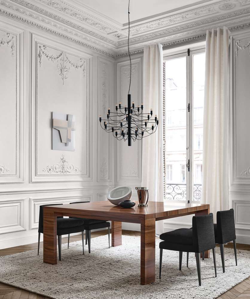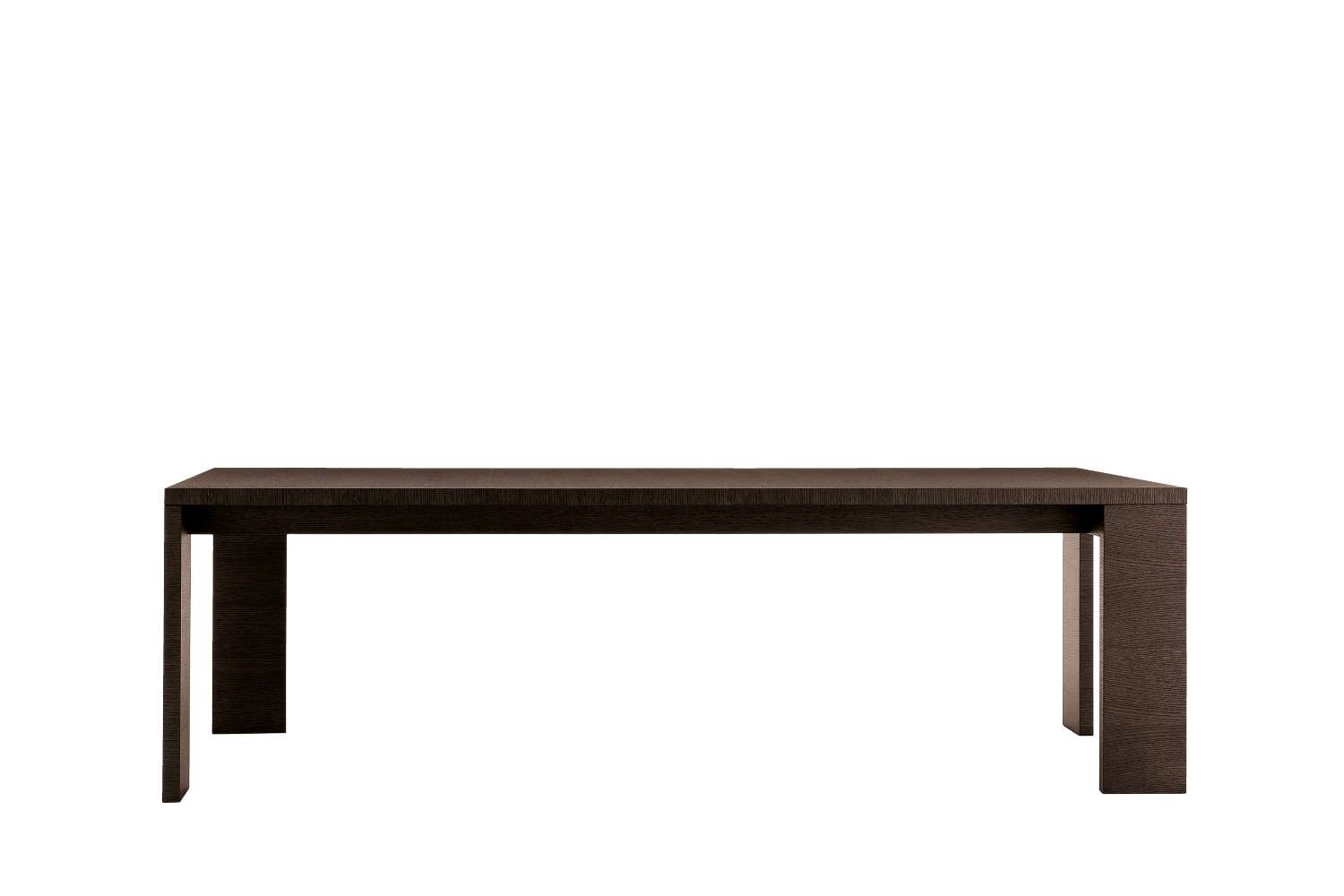 A striking table, with an essential design underscored by thick profiles and asymmetrical legs, making it a piece of furniture that dominates any room. Available in one square and two rectangular sizes (cm.160x160, cm.110 x 240, cm.110x300), the table now comes in a new version in semigloss Chilean tineo wood, a precise stylistic feature also found in other pieces in the collection, as well as in more classical natural wenge or brushed light, brushed black and grey oak. The special folding technique used to create it highlights the table’s refined workmanship, creating perfect continuity between the surface and the edges of the top.