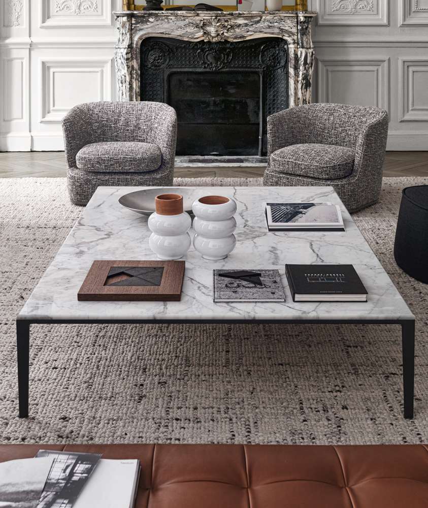 A series of low tables combining slender die-cast aluminium structures with beautiful marble tops. Available in one square and two rectangular sizes (cm.90x90, cm.90x130, cm.130x180), the tables can be customised in a wide variety of finishes. For the tops: Calacatta white marble, Marquinia black, Guatemala green and Sahara noir. For the structures: aluminium with a bronzed nickel finish, black chrome, graphite, or amber bronze.