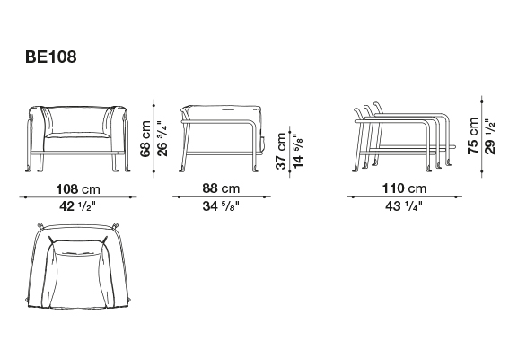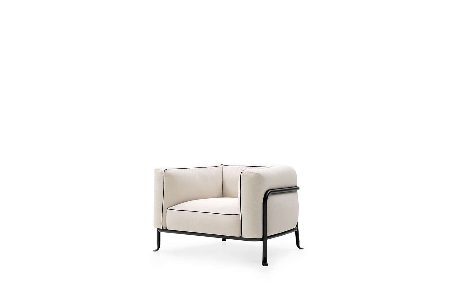 Borea is a complete and eclectic collection of outdoor seats and tables designed by Piero Lissoni. The numerous pieces in the collection have in common tubular metal structures with a fluid and seamless design, without joints and interruptions, captivating and even emerging in the detail that extends to the base. The metal bending processes take advantage of techniques typically used in the aeronautical sector and transport them into the world of outdoor furniture bringing life to a collection with an unmistakable style. The collection includes two- and three-seater sofas, an oversized armchair, a low small armchair and a dining chair, all with stackable aluminum structures painted. Comfort is ensured by generous cushions, which are not only soft and relaxing but were also developed to be sustainable. Paddings are in fact made with polyester fiber filling coming from recycled PET plastic bottles enveloping a different densities polyurethane core. 510 1500 ml bottles are needed to create the padding for a Borea three-seater sofa, 390 bottles for the twoseater sofa, 280 for the armchair.