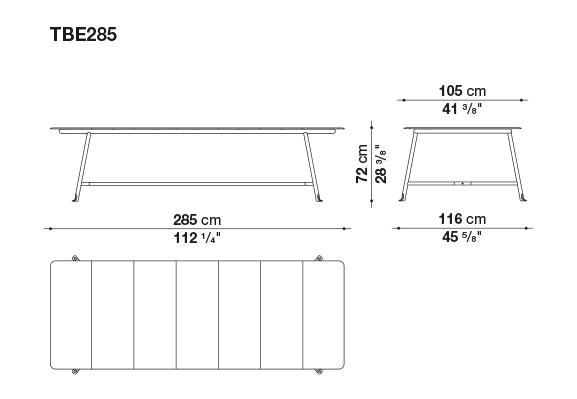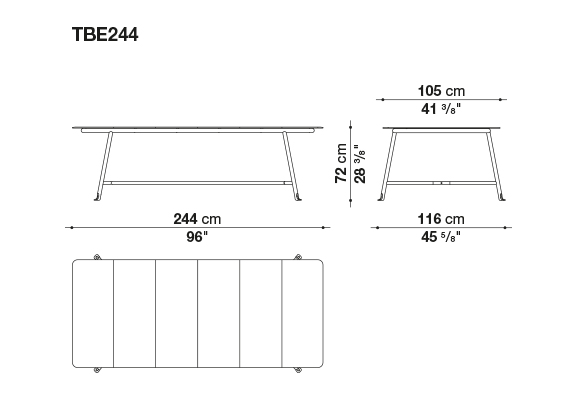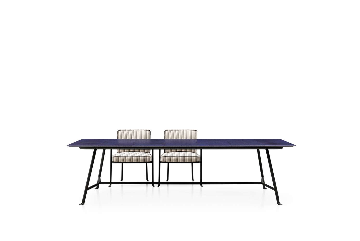 The dining tables reflect the design and shades of the seating structures, but use steel instead of aluminum to support distinctive tops in glazed lava stone. The lava stone comes from the slopes of Mount Etna (Sicily, Italy) and is available in large rectangular tiles in three bright colours which harmonize perfectly with the whole collection. The glazed surface is made with a special material obtained by recycling the glass of discarded TV and PC monitors, applied directly to the stone through an exclusive manufacturing process. The tables are available in two sizes to accommodate six and eight people respectively.