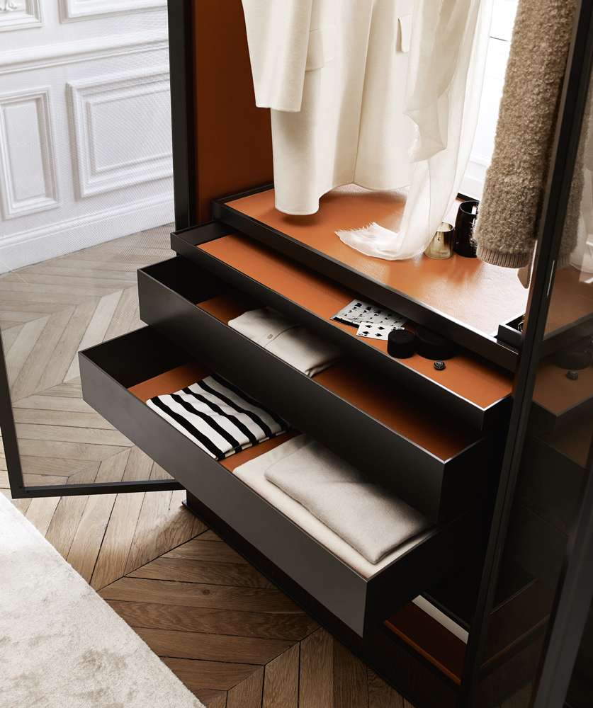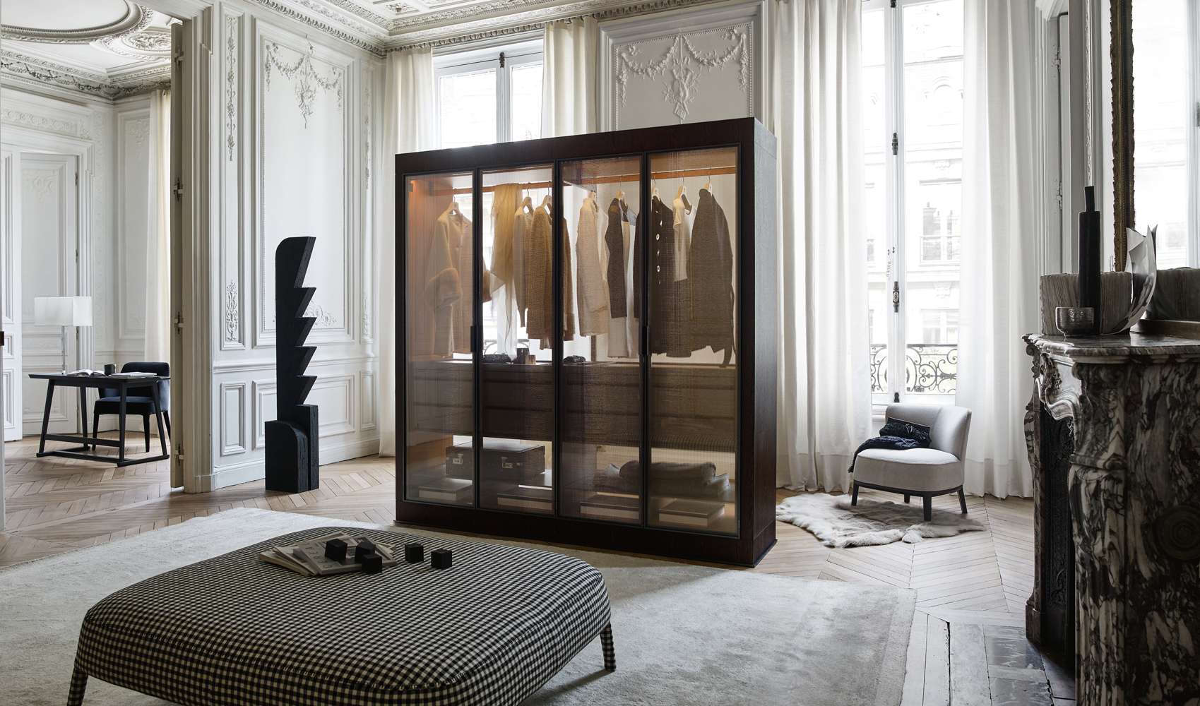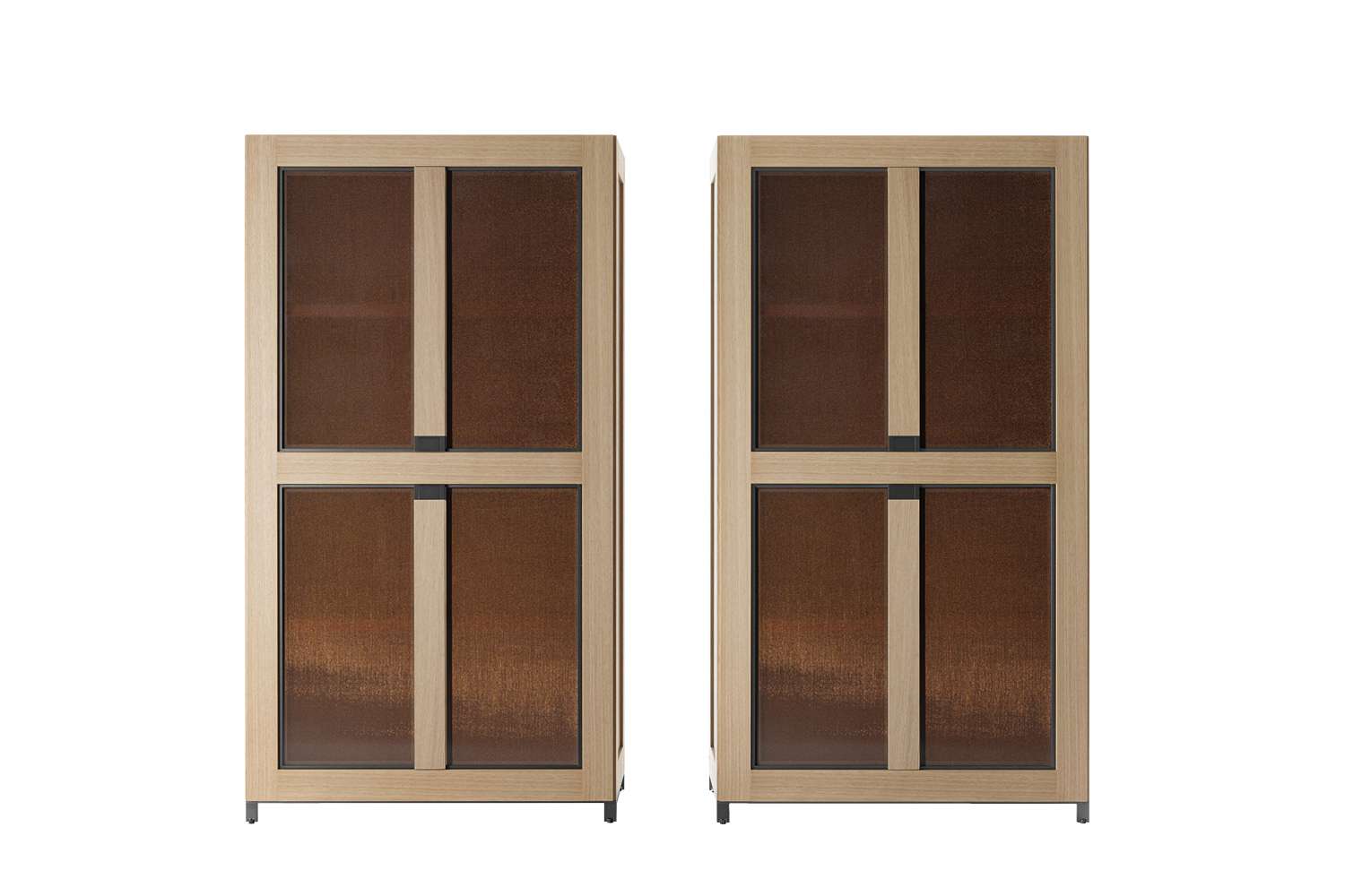 The Eracle series extends from the living room to the bedroom with an unusual storage unit of strictly calibrated proportions, very easy to use. The new volume, also in double-sided version, has the same characteristics defining the storage units for the living room: volumes, doors and back panels with coupled transparent glass (with high-tech internal fabric) and bronzed nickel edges. The fine materials guarantee a minimal and sophisticated look also to the new element: the frame is made of brushed light oak, grey oak, brushed black oak, smoked oak and natural wenge; the inside is covered with coloniale leather melamine faced and equipped with a bronzed nickel painted chest of drawers. Trays and clothes rails covered in coloniale leather and a full range of accessories offer a wide range of personalization solutions. The light placed inside the unit is a refined vintage detail recalling the display furniture of the 1950’s.