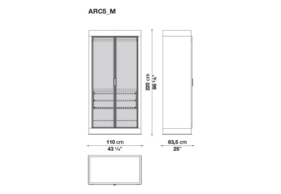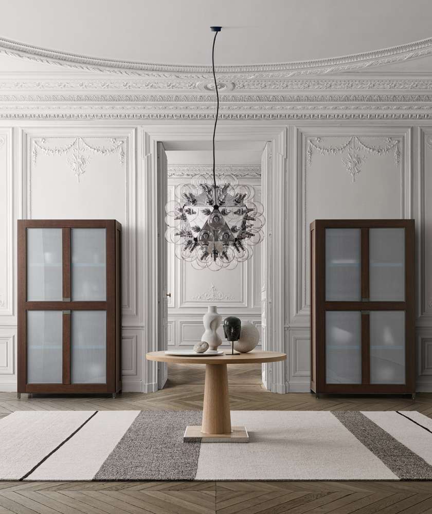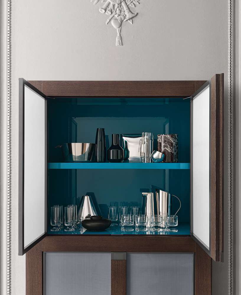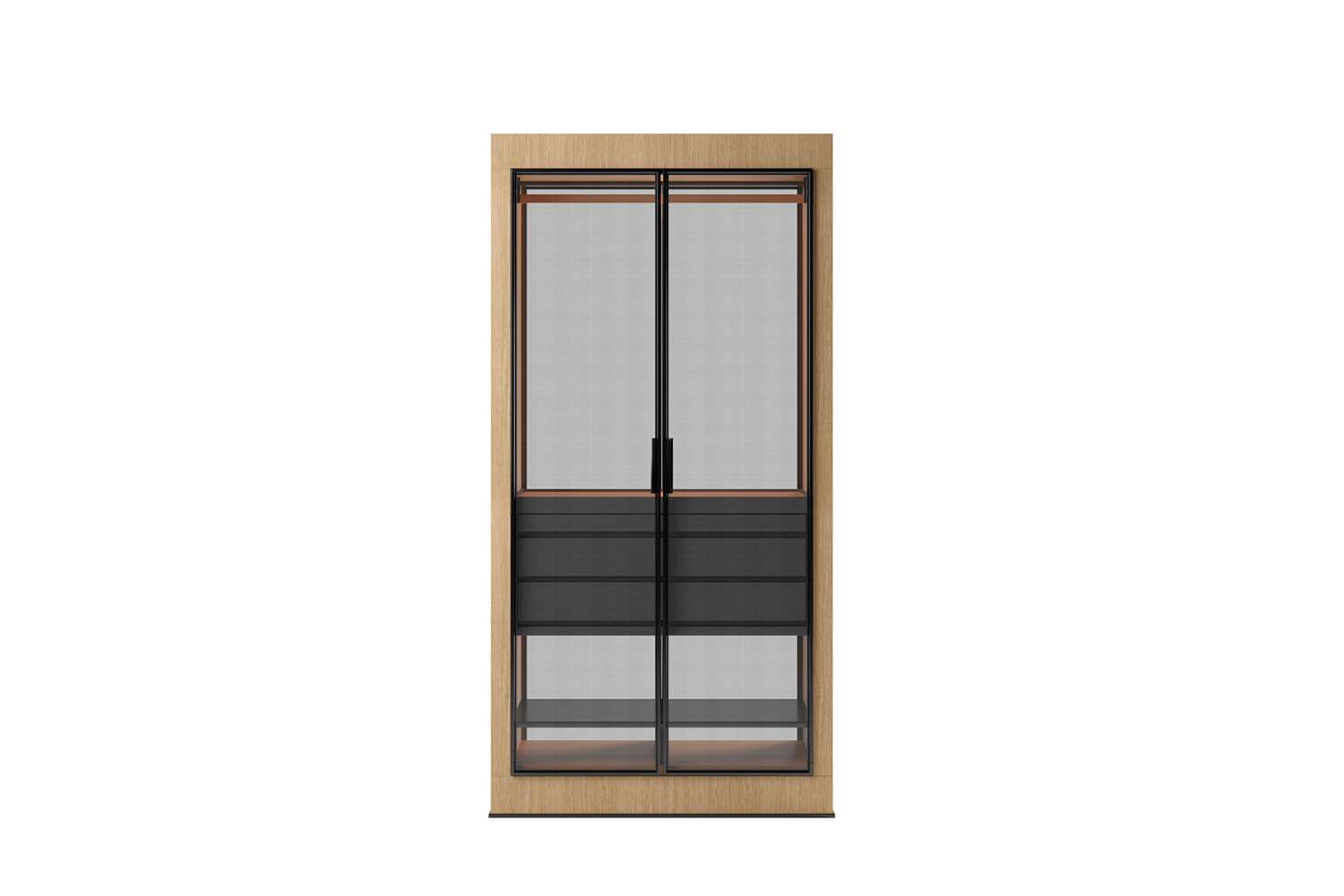 The Eracle series extends from the living room to the bedroom with an unusual storage unit of strictly calibrated proportions, very easy to use. The new volume, also in double-sided version, has the same characteristics defining the storage units for the living room: volumes, doors and back panels with coupled transparent glass (with high-tech internal fabric) and bronzed nickel edges. The fine materials guarantee a minimal and sophisticated look also to the new element: the frame is made of brushed light oak, grey oak, brushed black oak, smoked oak and natural wenge; the inside is covered with coloniale leather melamine faced and equipped with a bronzed nickel painted chest of drawers. Trays and clothes rails covered in coloniale leather and a full range of accessories offer a wide range of personalization solutions. The light placed inside the unit is a refined vintage detail recalling the display furniture of the 1950’s.