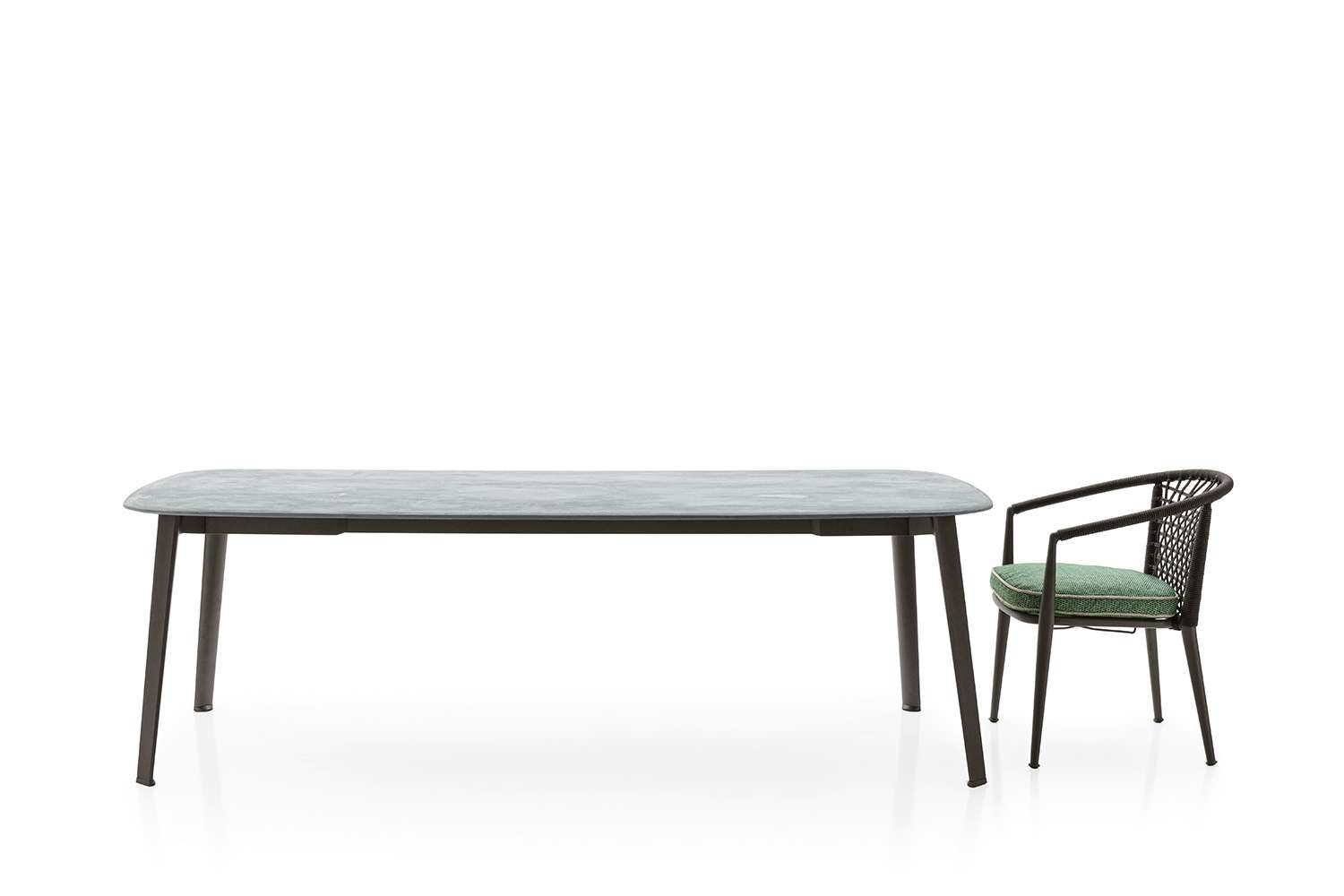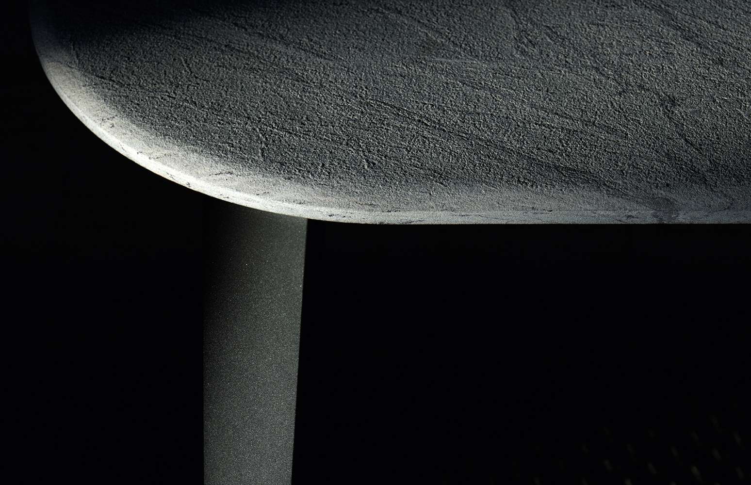 The Ginepro table is made with an anthracite painted aluminum structure and a Serpentine stone top. Extremely durable and precious as the linear and timeless style. With its two shapes (round and rectangular with rounded corners) and four dimensions, it lends itself to be placed in different outdoor enviroments: terraces, verandas, patios and gardens.