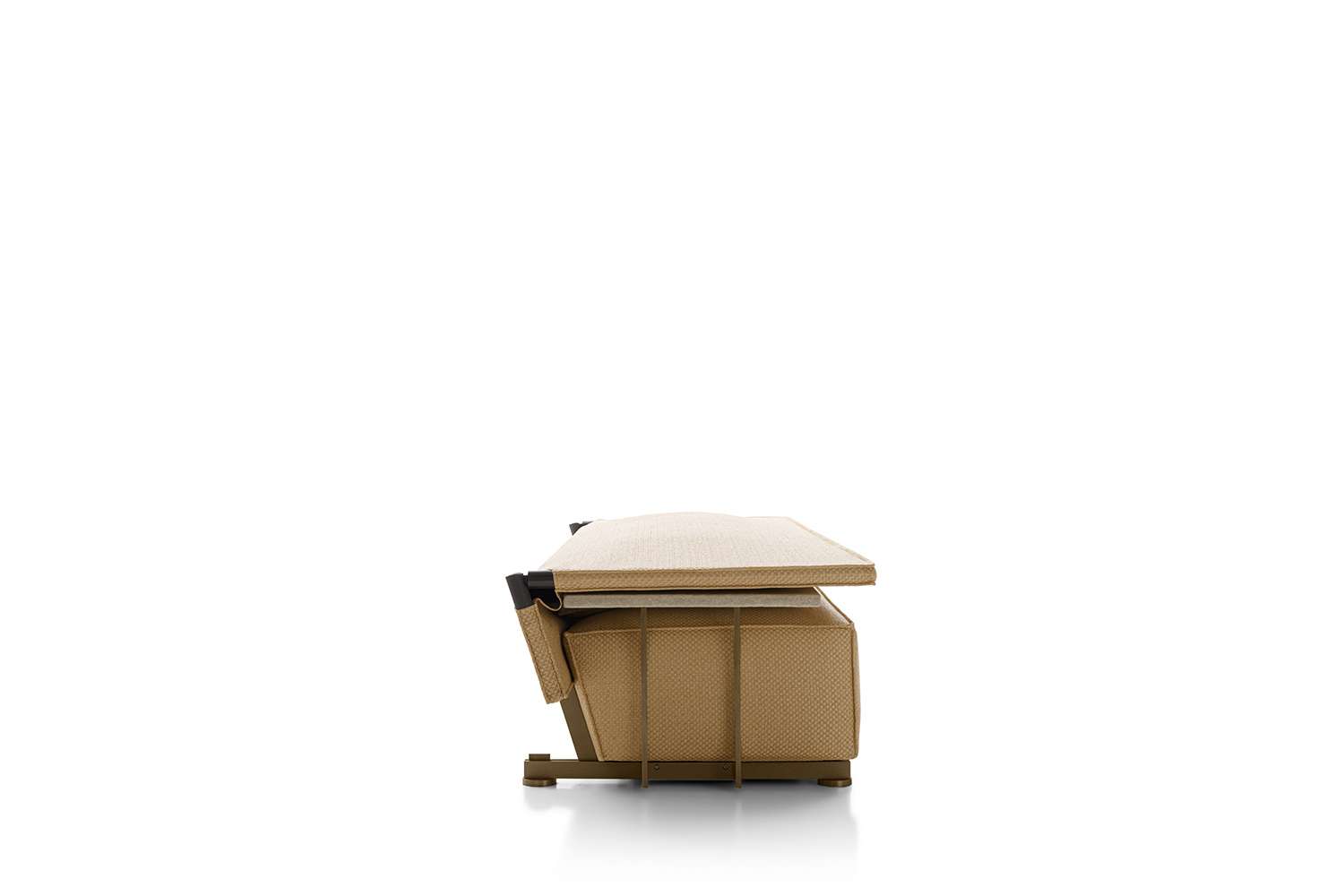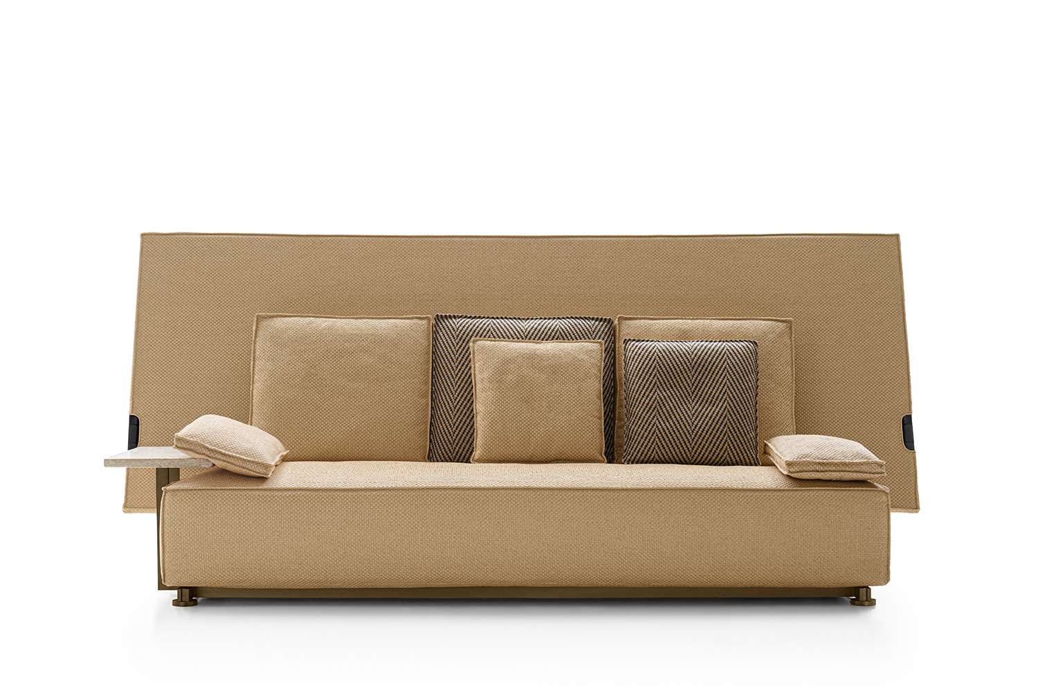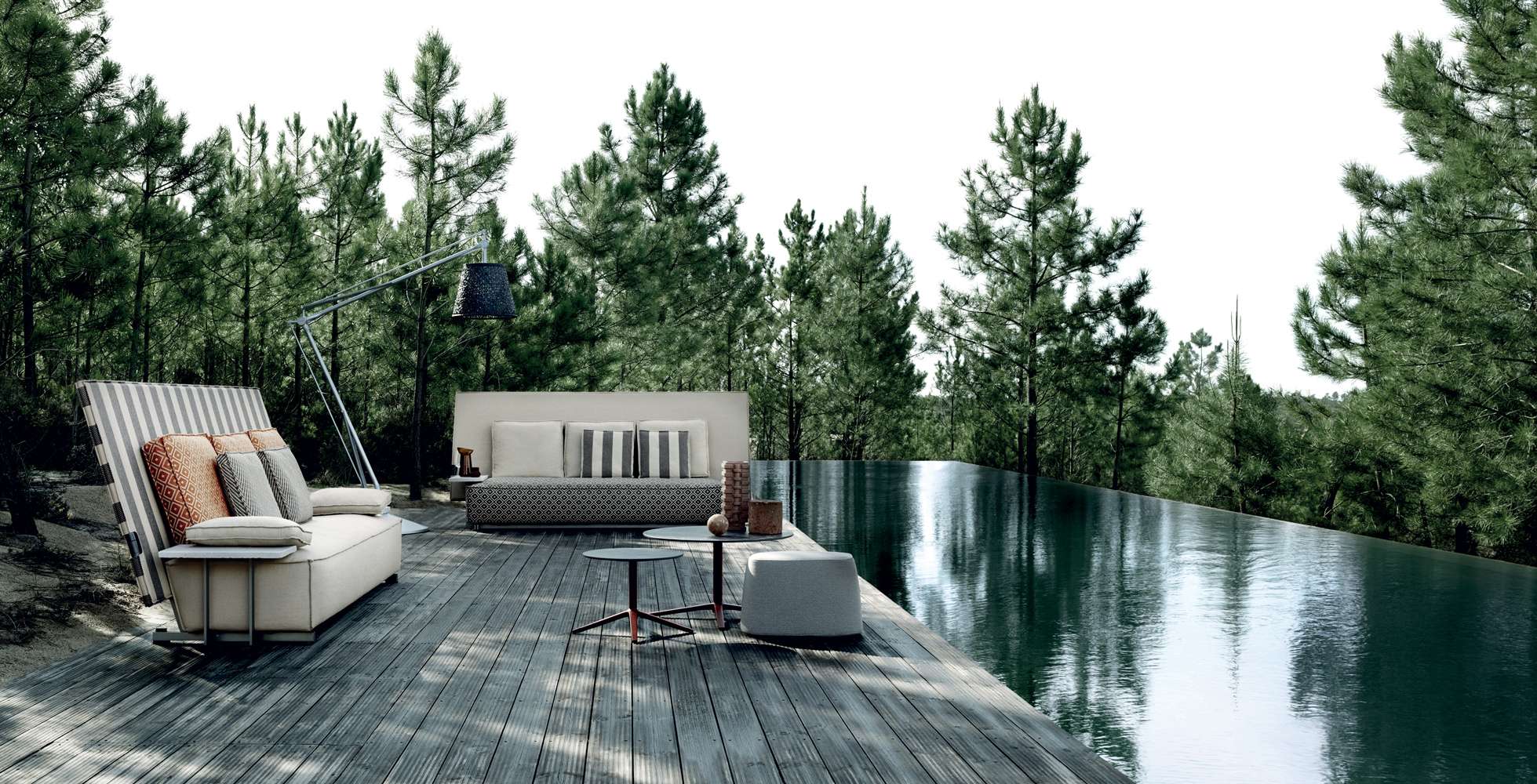 The very first collaboration between B&B Italia and Philippe Starck leads to the birth of a sofa and an armchair, both with impressive dimensions and a highly scenographic presence, that surprisingly combine an unusual shape and an unexpected function, with a name that really attracts attention. Oh, it rains! is a piece of considerable impact, destined to last over time and to be talked about, but also to be used in the most unexpected ways and contexts. Philippe Starck started his research for this project by going back to the origins of outdoor furniture, that of nomads and soldiers: desert tents and field equipment, colonial colors and very light materials, essential shapes with functions connected with rapid action. We notice Oh, it rains! right away for its large backrest. It isn’t a simple decorative element, though. It acts like a wall or a partition to create an intimate and private setting, and, when necessary, it folds down on top of the seat and - voilà - the seat and cushions are covered and protected. Colours and materials go hand in hand with the initial concept and the collection introduces colonial shades and raffia-effect waterproof fabrics.