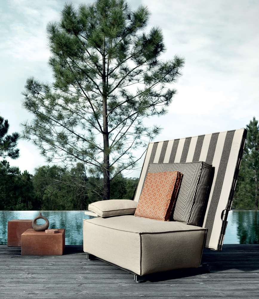 The very first collaboration between B&B Italia and Philippe Starck leads to the birth of a sofa and an armchair, both with impressive dimensions and a highly scenographic presence, that surprisingly combine an unusual shape and an unexpected function, with a name that really attracts attention. Oh, it rains! is a piece of considerable impact, destined to last over time and to be talked about, but also to be used in the most unexpected ways and contexts. Philippe Starck started his research for this project by going back to the origins of outdoor furniture, that of nomads and soldiers: desert tents and field equipment, colonial colors and very light materials, essential shapes with functions connected with rapid action. We notice Oh, it rains! right away for its large backrest. It isn’t a simple decorative element, though. It acts like a wall or a partition to create an intimate and private setting, and, when necessary, it folds down on top of the seat and - voilà - the seat and cushions are covered and protected. Colours and materials go hand in hand with the initial concept and the collection introduces colonial shades and raffia-effect waterproof fabrics.