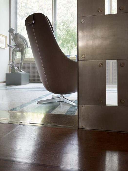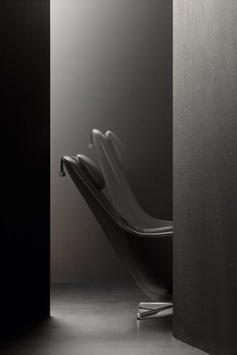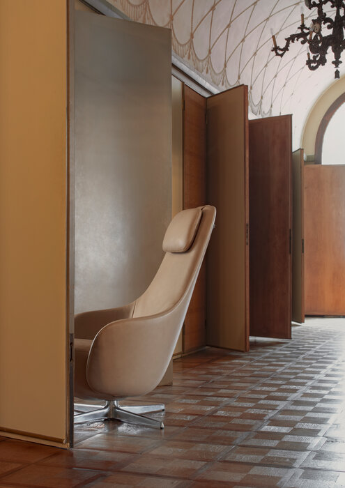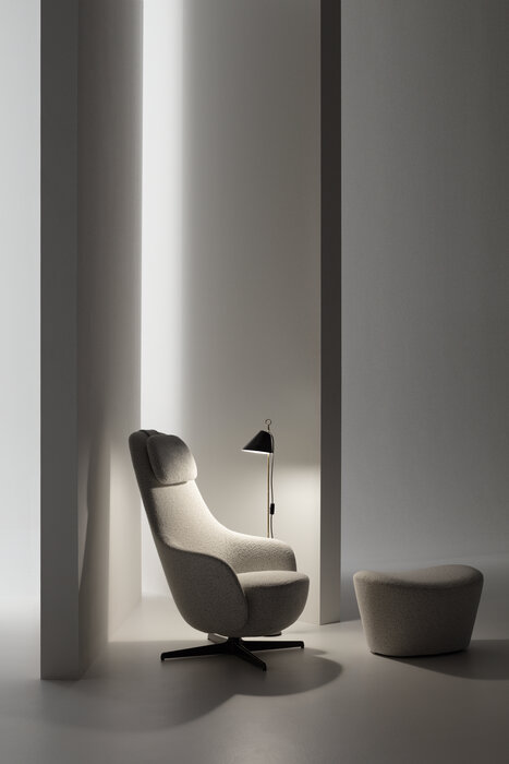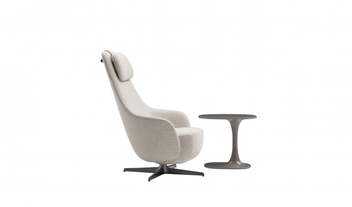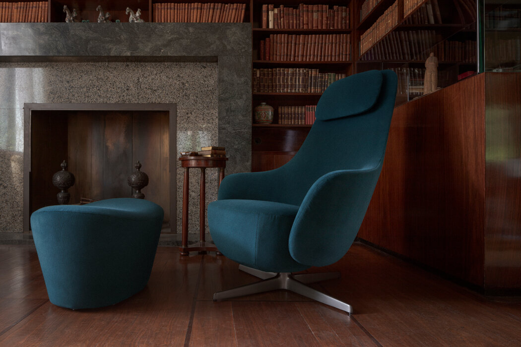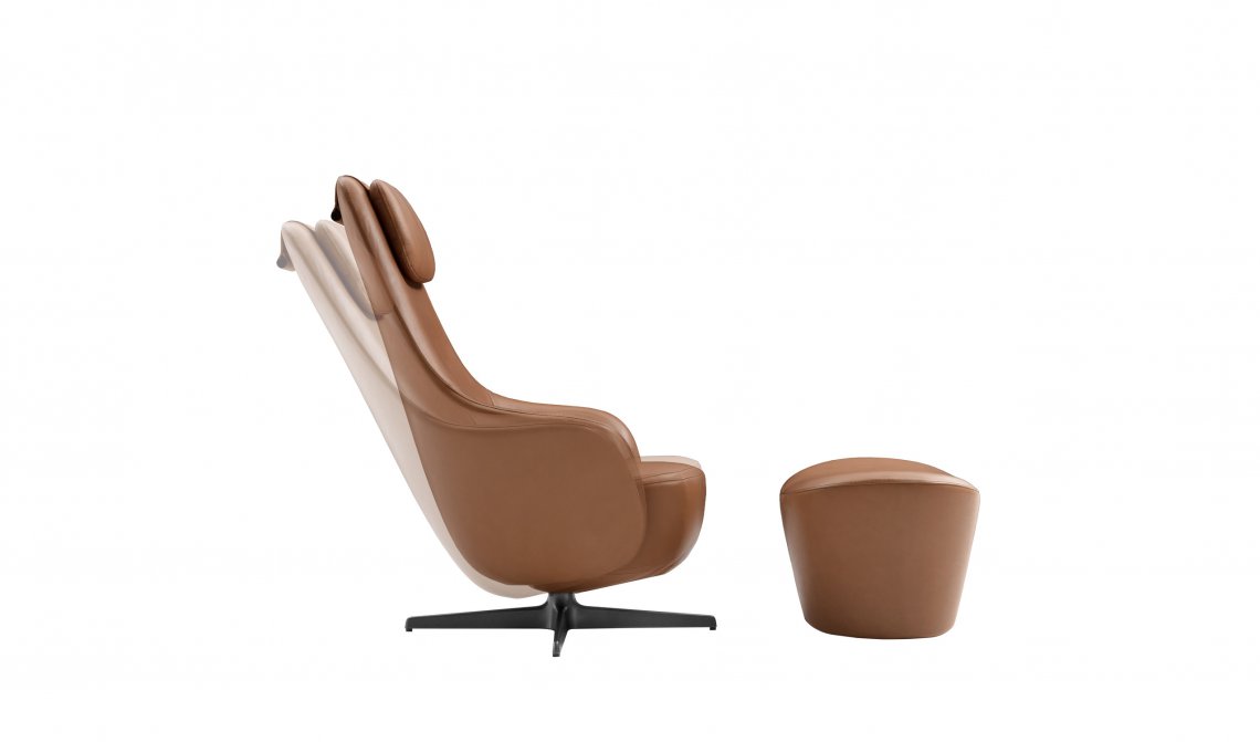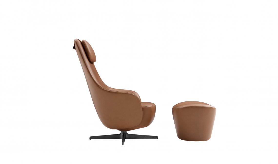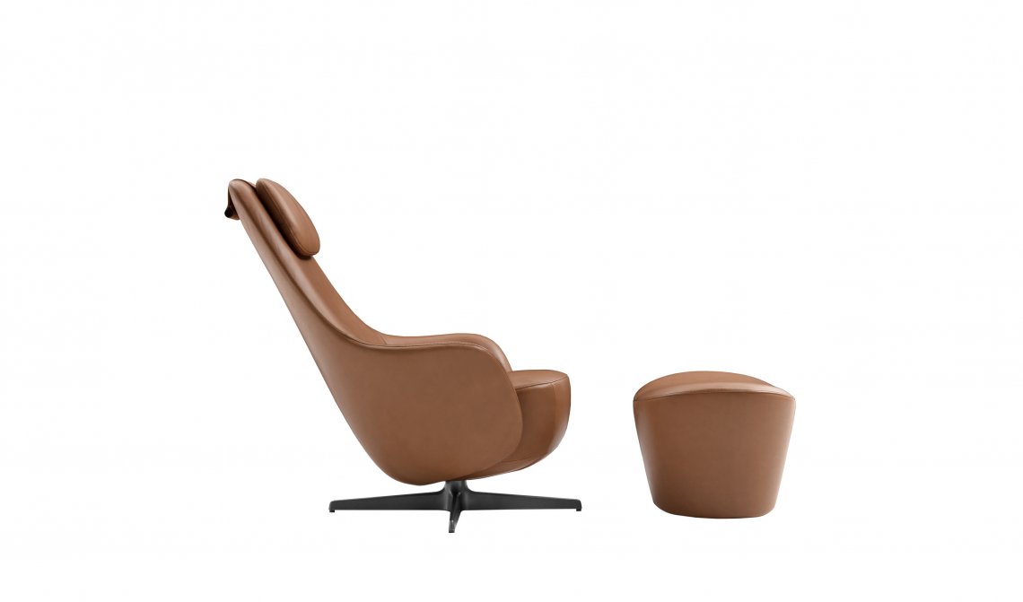 Harbor Laidback is a versatile and innovative armchair that redefines the concept of relaxation continuing the tradition of the Harbor armchairs, a classic it shares the origin of the inverted truncated cone shape and the harmonious and flowing line. Equipped with a swivel aluminium base with four spokes, Harbor Laidback has an unprecedented mechanism, perfectly hidden in the frame, that allows the simultaneous movement of the backrest and the seat. To control the movement, all you have to do is operate a lever strategically placed between the cushion and the armrest: once you have reached the most comfortable position, you release the lever and the backrest stops at the desired angle. To increase the feeling of well-being, the seat accompanies the backrest and moves almost unnoticeably. Harbor Laidback also features a height-adjustable upholstered headrest, distinguished by its distinctive counterweight, and can be combined with a cosy matching footrest and a round ottoman with removable wood tray. The upholstery is available in leather or fabric embellished with an elegant saddle stitch that recalls the sophistication of saddlery and underlines the harmony of the shapes. The zip that crosses the backrest is an aesthetic and functional element that once again reveals the harmony with the Harbor family. In terms of form and materials, the identity of Harbor Laidback is born hybrid, adaptable to work environments as well as purely domestic spaces. The calibrated proportions and the height of the top of the seat make Harbor Laidback the ideal place to use a computer or tablet, to have a video call or enjoy a movie, to concentrate on a report or to retreat with a good book.