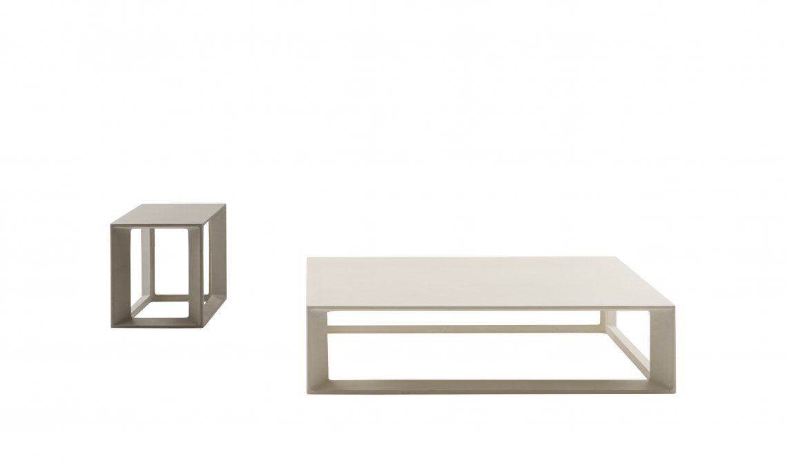 The decisive yet soft lines of Pablo Outdoor seats are perfectly balanced in the small cement outdoor tables. Linear, solid, and highly geometric shapes represent the heart of these architectural objects with a certain effect. To provide multiple solutions, the small Pablo Outdoor tables come in two sizes and two colours. The colours give shape to a large, low model that works perfectly as an island defining a conversation area, and a higher, narrower model with a square base, is ideal as a service element next to the sofa or armchair.