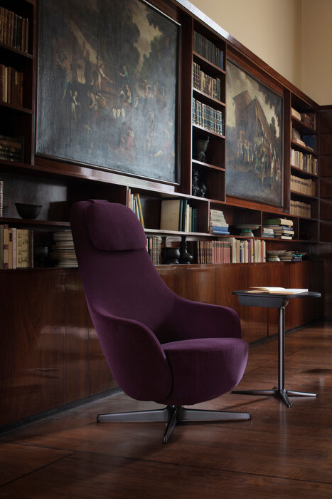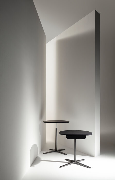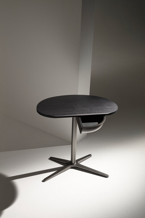 Sir Vito is a multi-purpose small table. Rounded shapes and variable height are the main features, as well as a small extractable tray it can be equipped with. The surface of the top, supported by an asymmetrical four-spoke die-cast aluminium base, gently flexes into the front of the tray, creating a naturally fluid form. The uniformity of the curve is also guaranteed by the movement of the tray, which is revealed by revolving on itself. The shaft conceals a convenient piston mechanism regulated by a ring nut that makes it easy to choose the height. This small detail expands the functions and uses of Sir Vito, which is suitable for any room, from the bedroom to the living room to the office, equally useful for placing a laptop, a book or a cocktail. Sir Vito is available in three versions. The first has a top and tray in ebony-stained frisé maple, a finish that enhances the nature of the wood by emphasising the grain and enhancing the perception of the precious nature of the material, with a structure in a bronzed nickel finish. The second features a single-colour painted top, tray and frame in different satin shades. The third combines the verve of the satin colours with the elegance of the bronzed nickel structure.