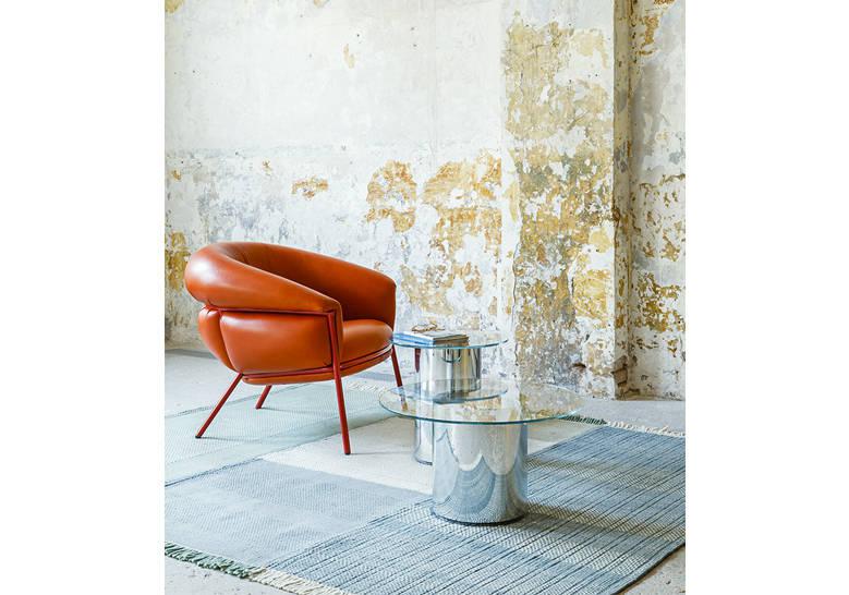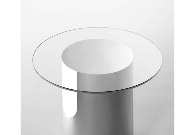 Las mesas auxiliares 2001 se fabrican en vidrio ultraclaro y un tubo de pyrex espejado, sin juntas ni uniones. Sus brillos metálicos son una ilusión óptica que evoca un futuro perfecto que ya pertenece al pasado.