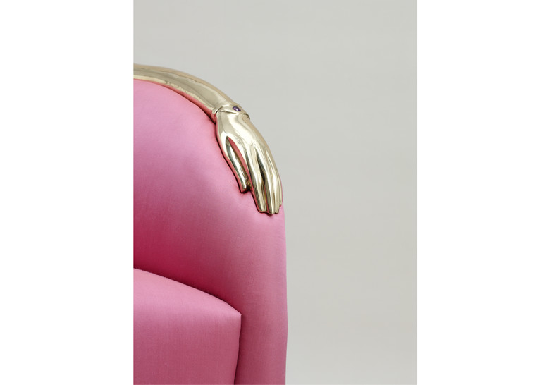 Remate superior del respaldo en fundición de latón pulido y barnizado.